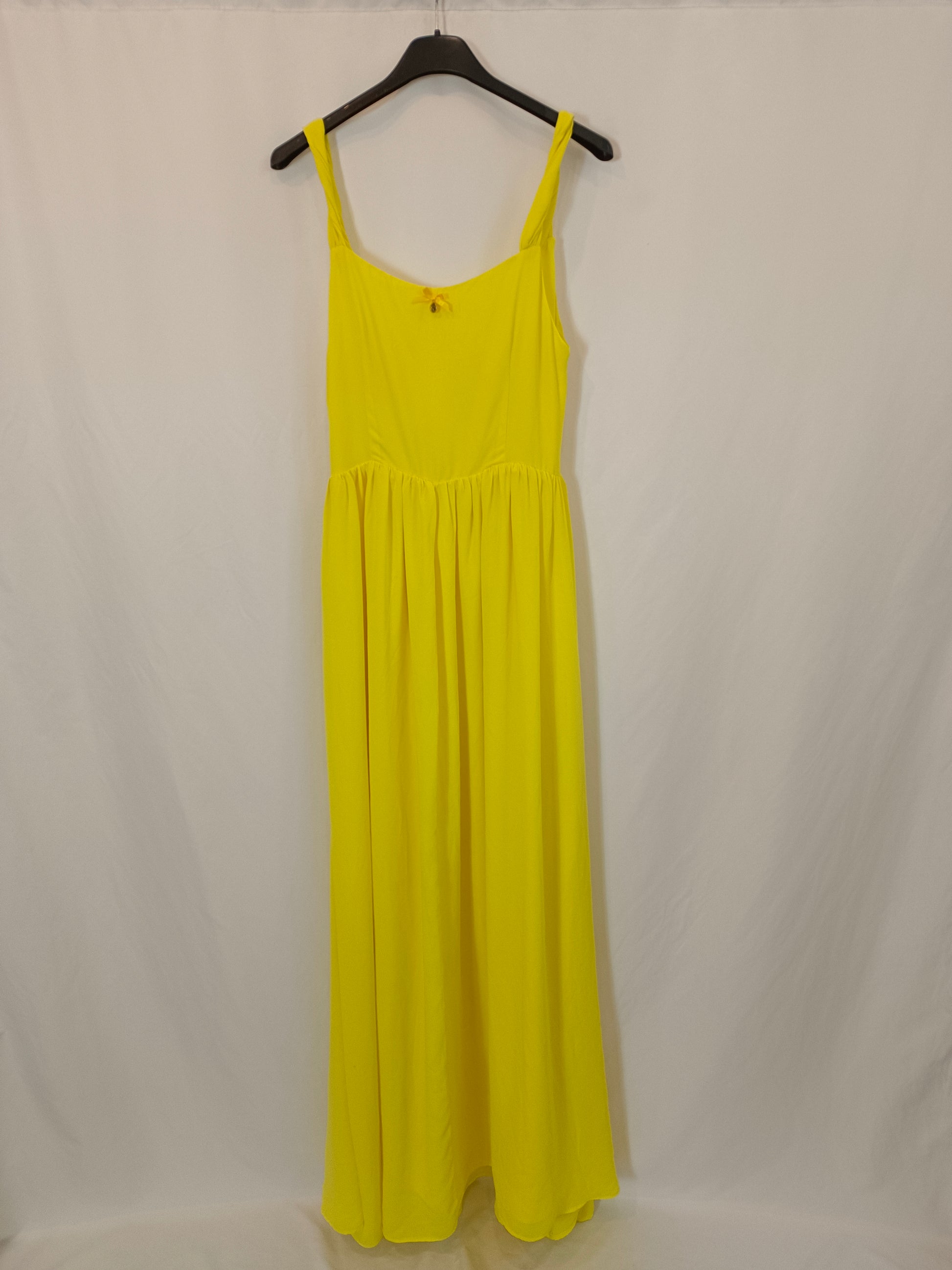 Flowing yellow long dress with a crossover neckline. 42 cm from armpit to armpit, 150 cm long.