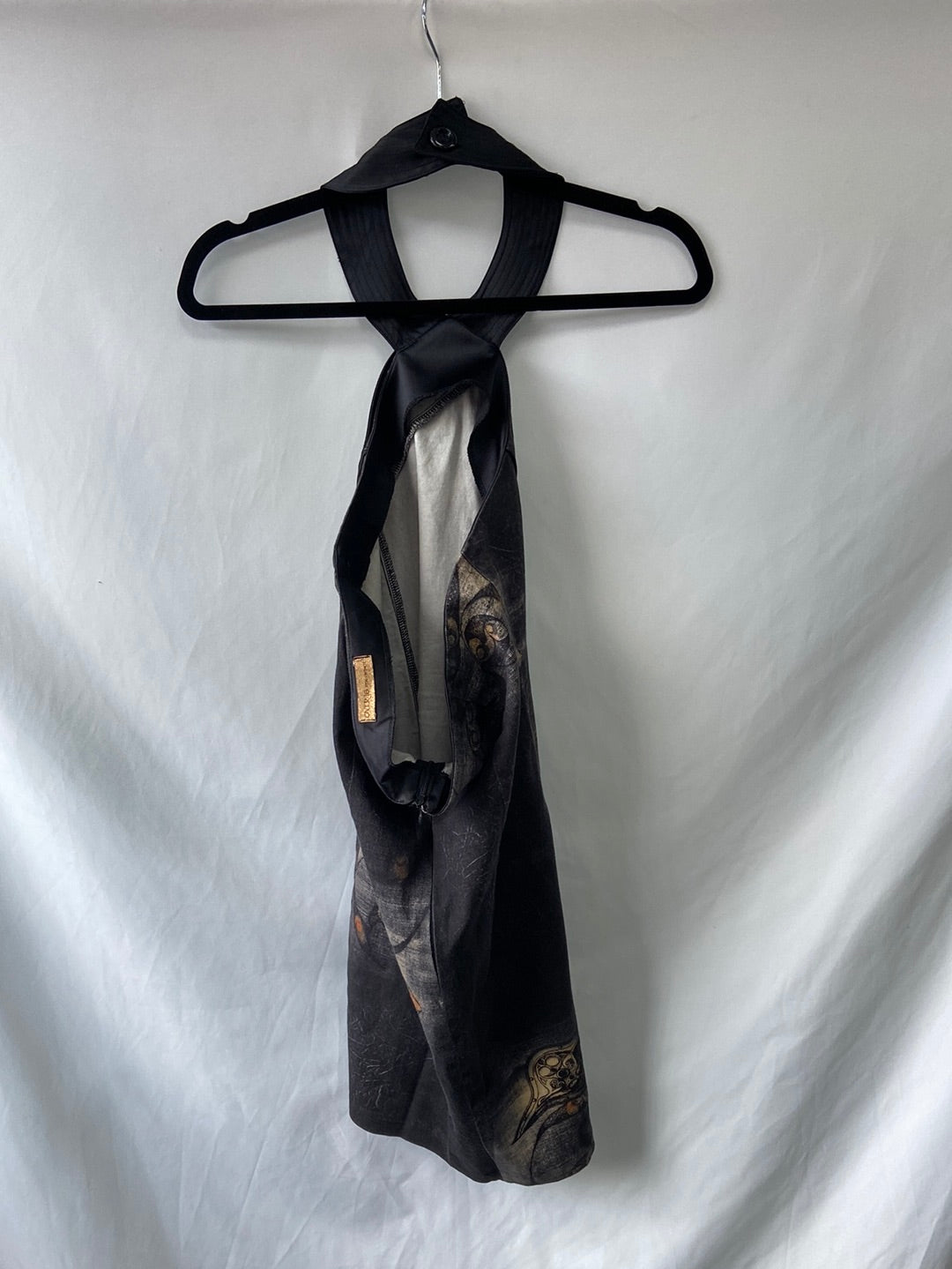 Stretchy gray dress with back zipper. Tied at the neck and open back. 97 cm long.
