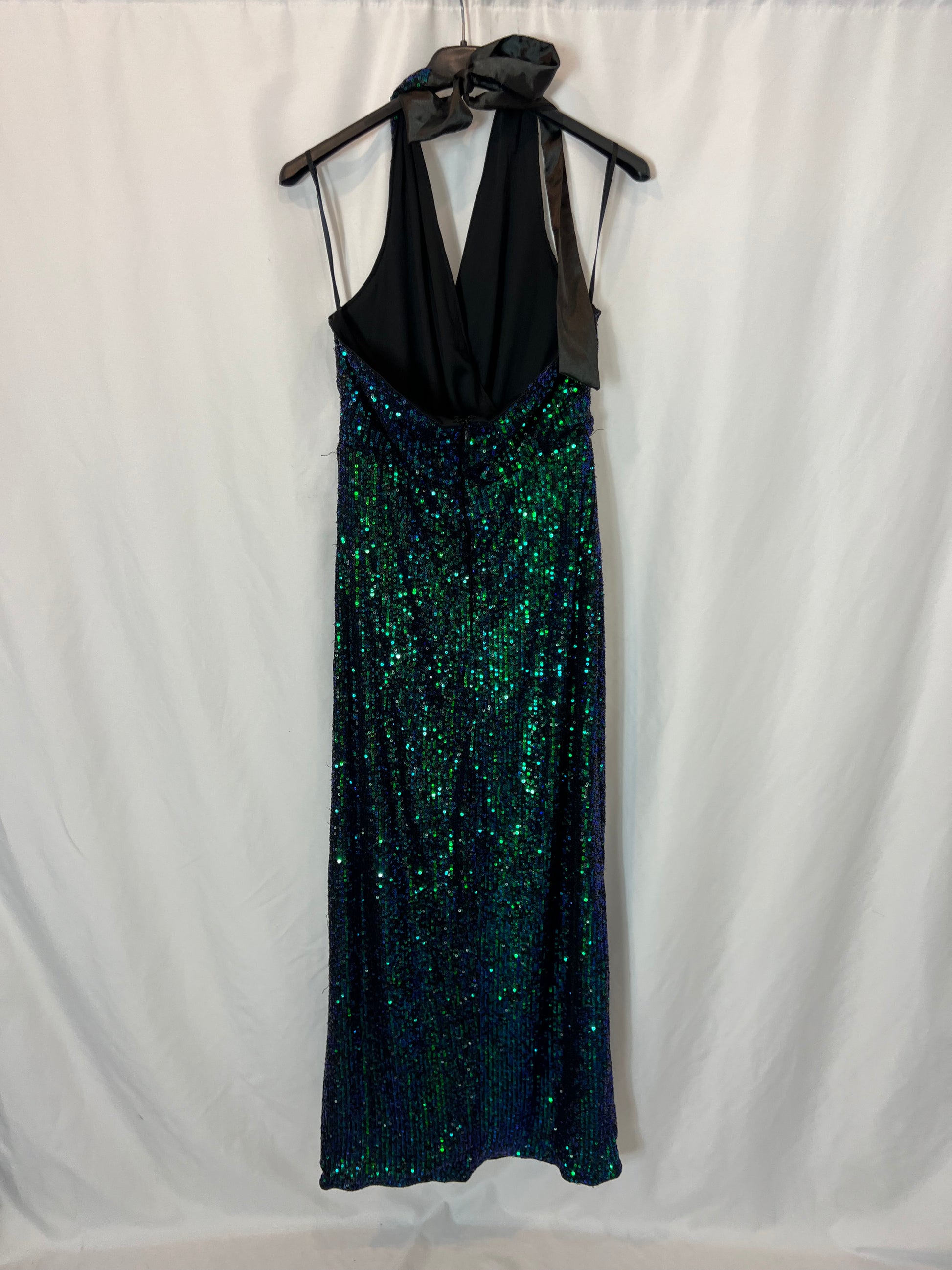 Long halter dress with purple and green sequins. Front slit and stretch fabric. 17" armhole to armhole, 39" length. Semi-stretch.
