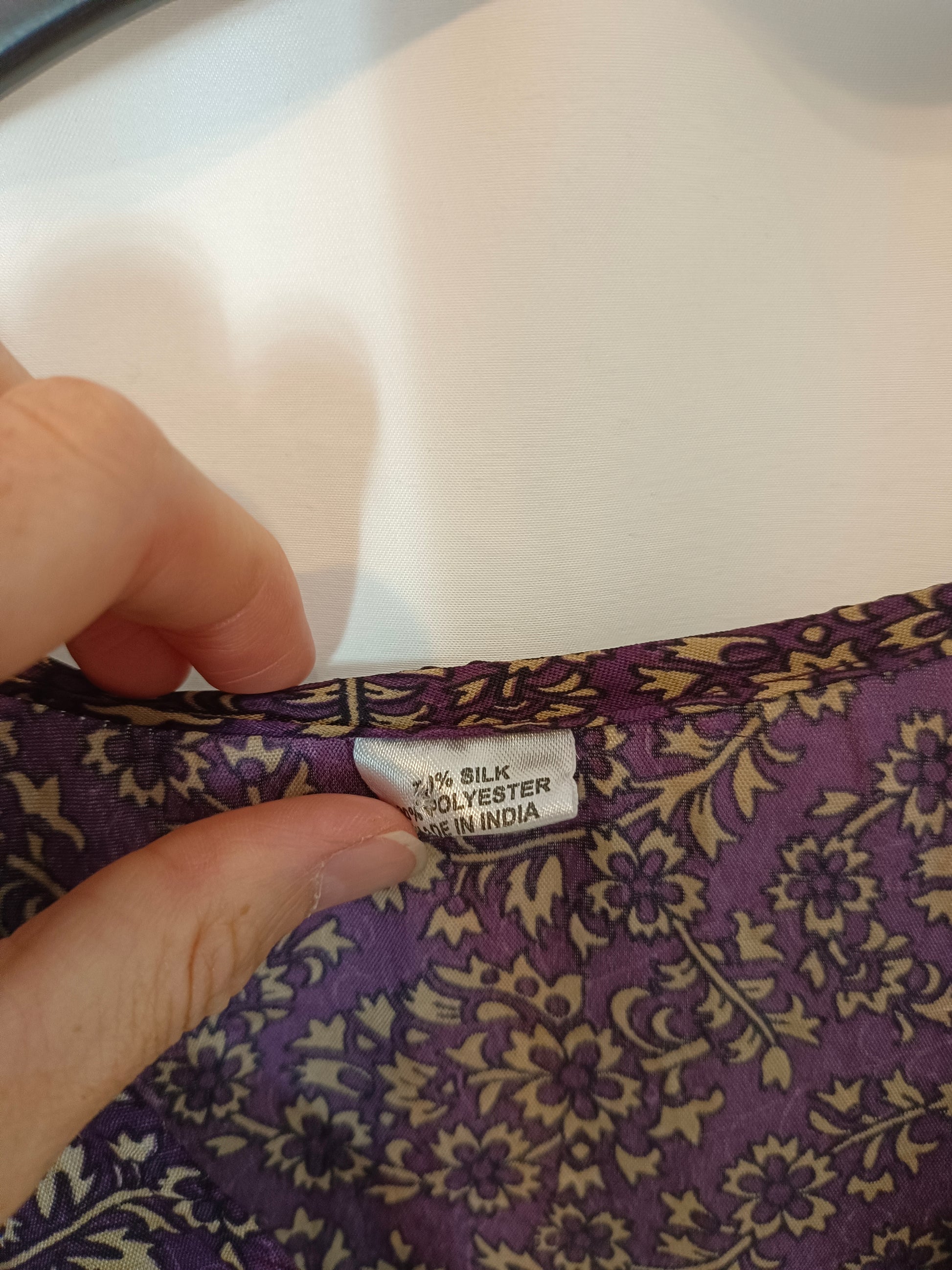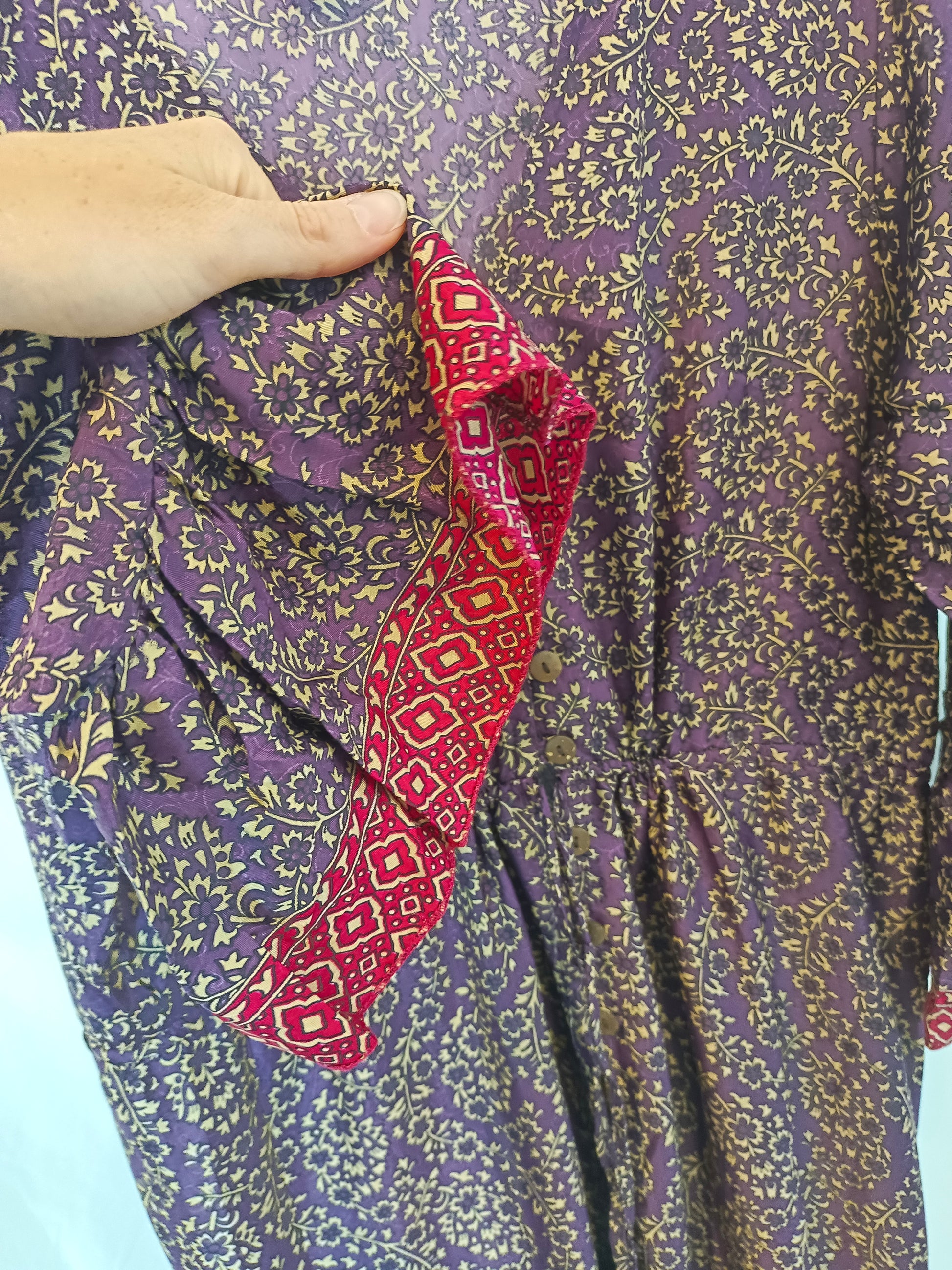 Long, flowing purple dress with a beige floral print. Buttoned.