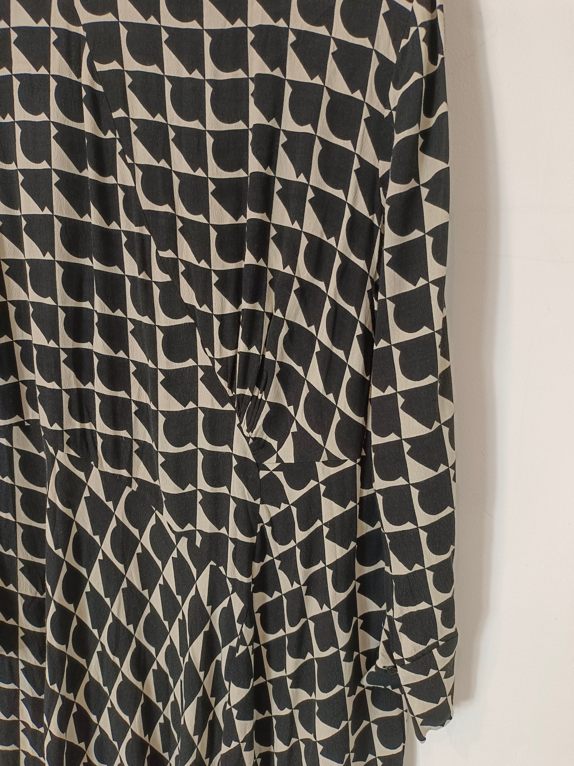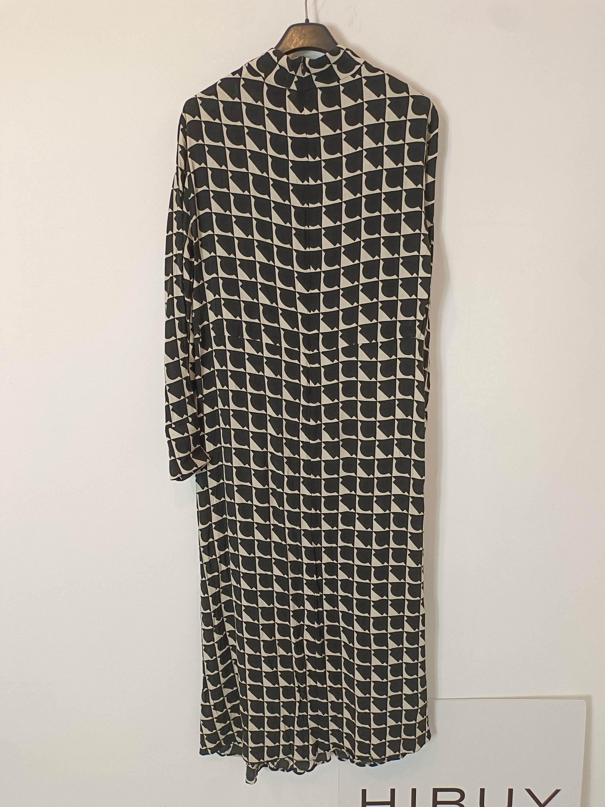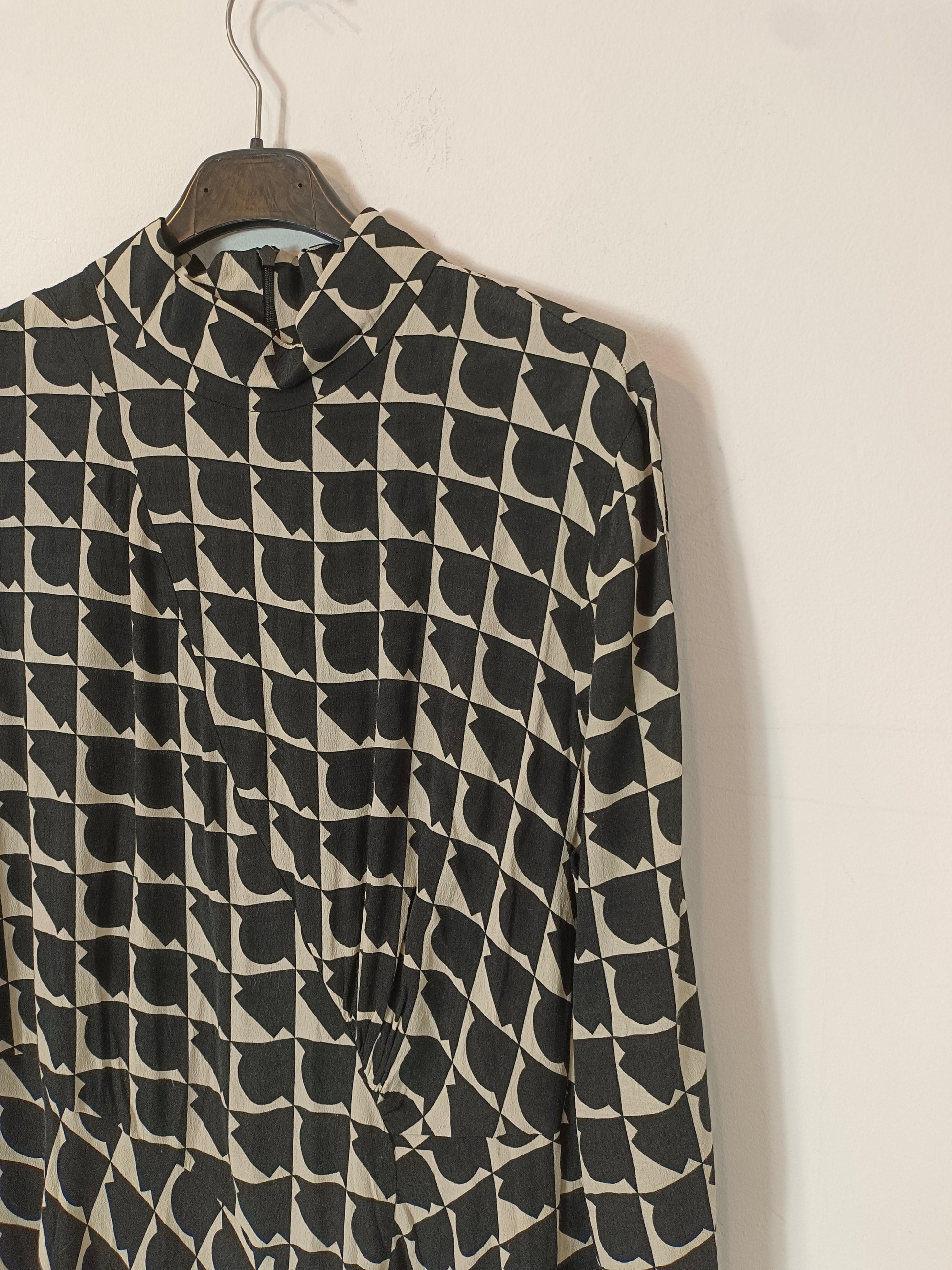 vestido largo blanco y negro estampado cuello perkins y detalles plisados