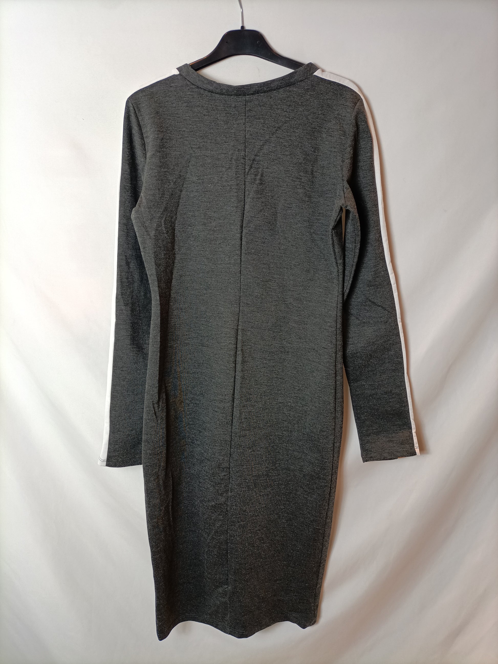 Gray midi dress with stripes on the sleeves. Stretch fabric. Length 106 cm.