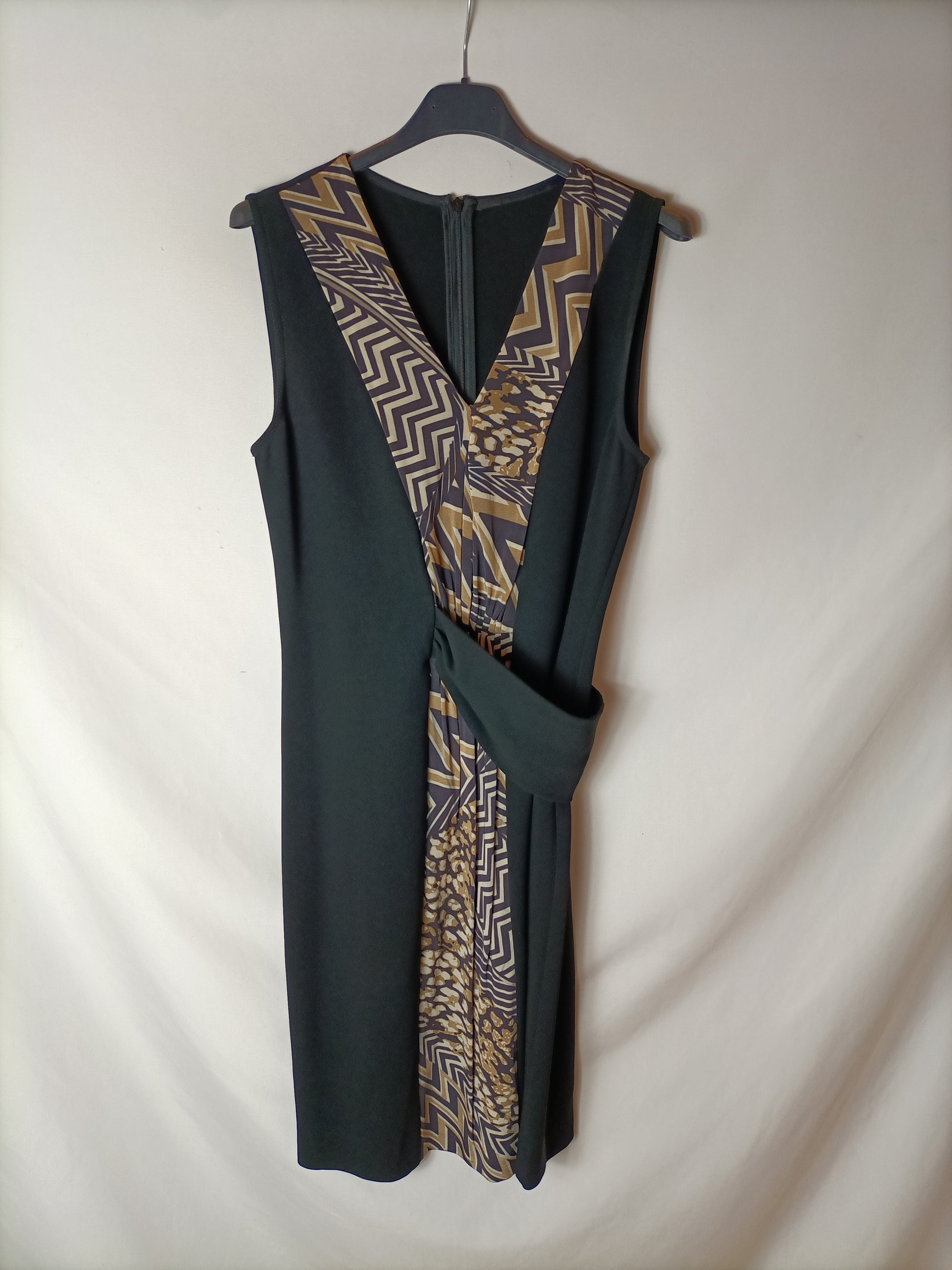 Short black dress with printed center detail. Stretch fabric. 38 cm from armhole to armhole.