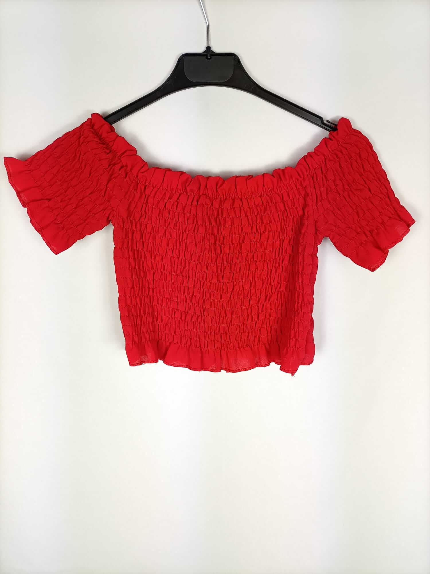 Short red honeycomb crop top with drawstring. Elastic. Length 34 cm.