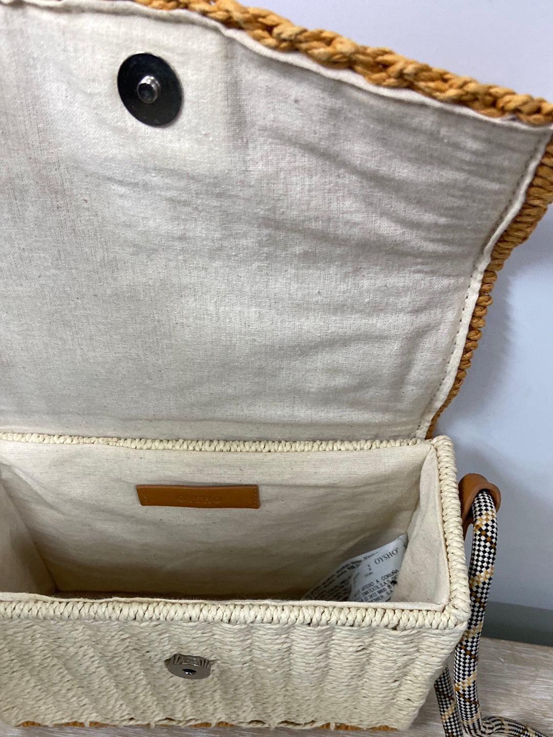 Rectangular, rigid wicker basket with a long handle in beige and mustard tones