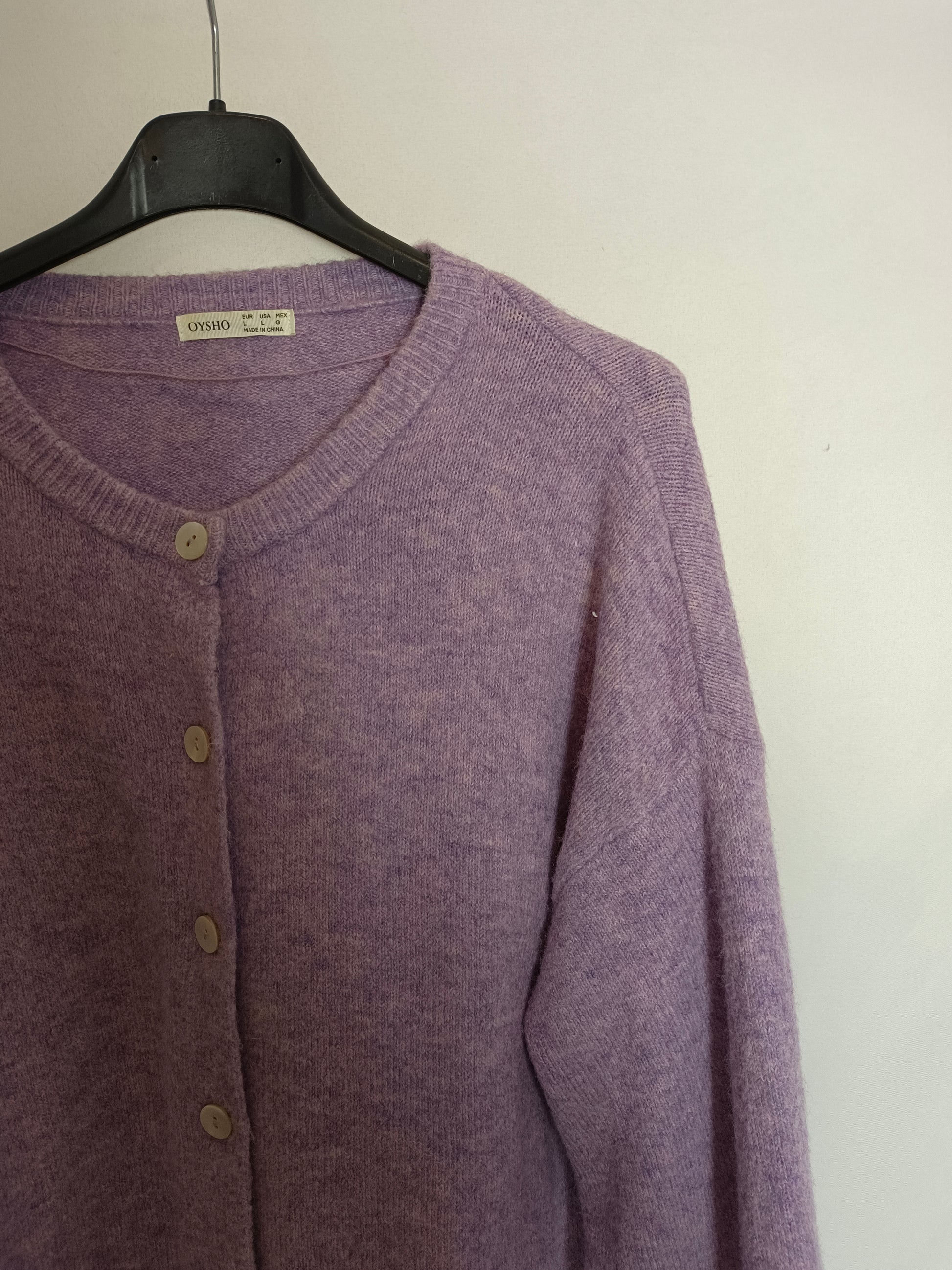 Purple button-down cardigan sweater. Soft fabric. Total look with top.