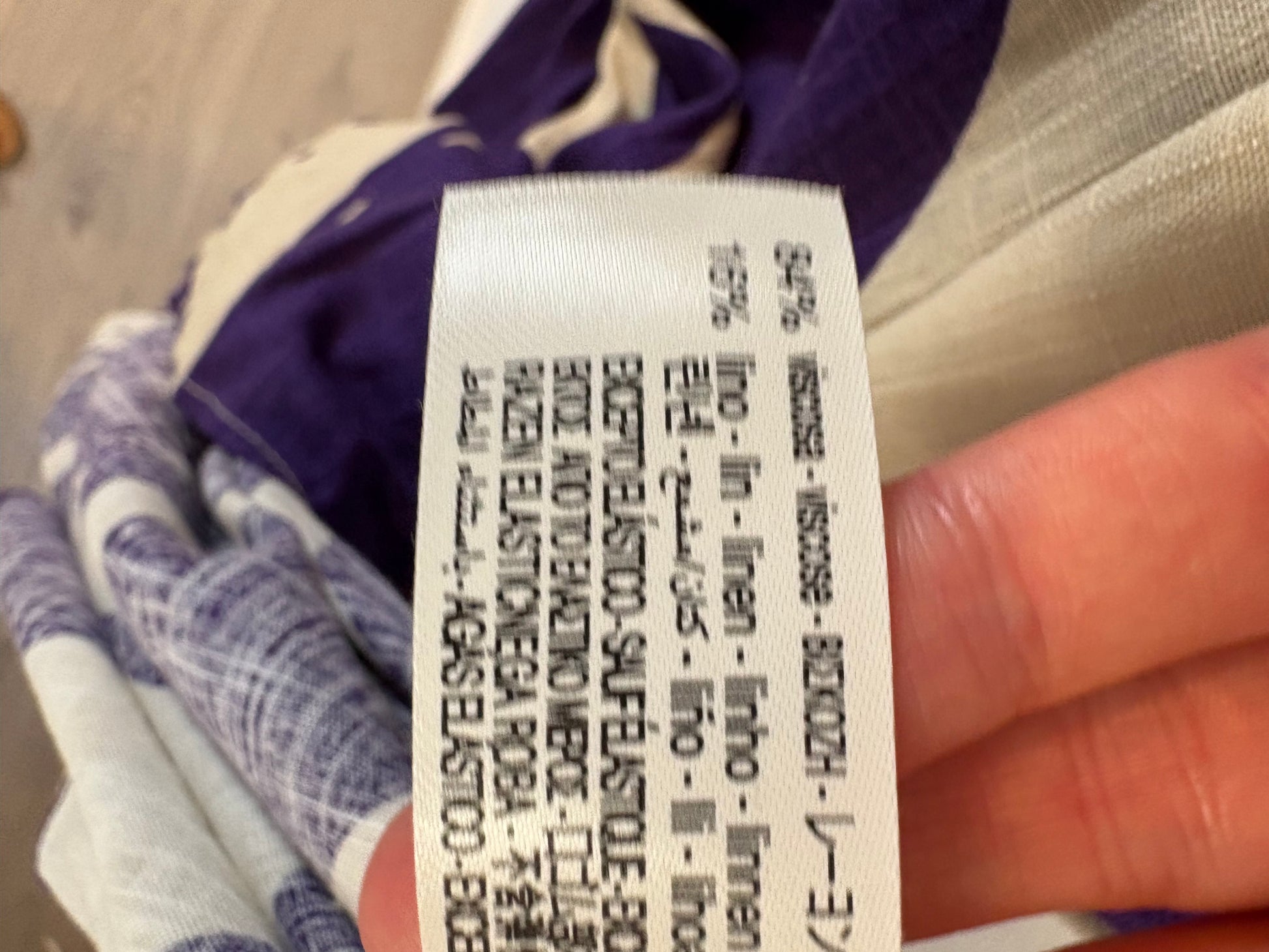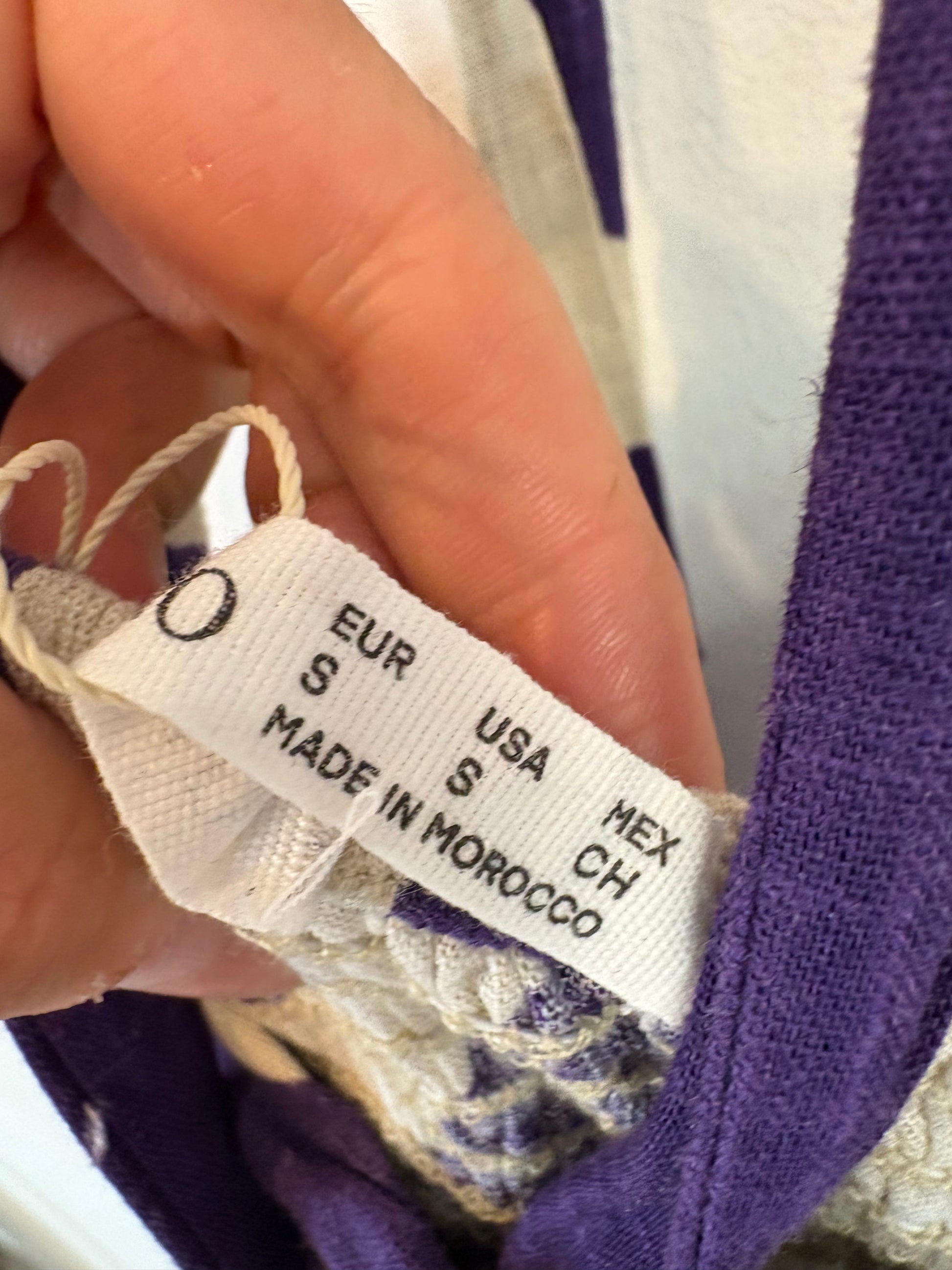 Long beige dress with purple details. Elastic neckline with bow. Length 110 cm.