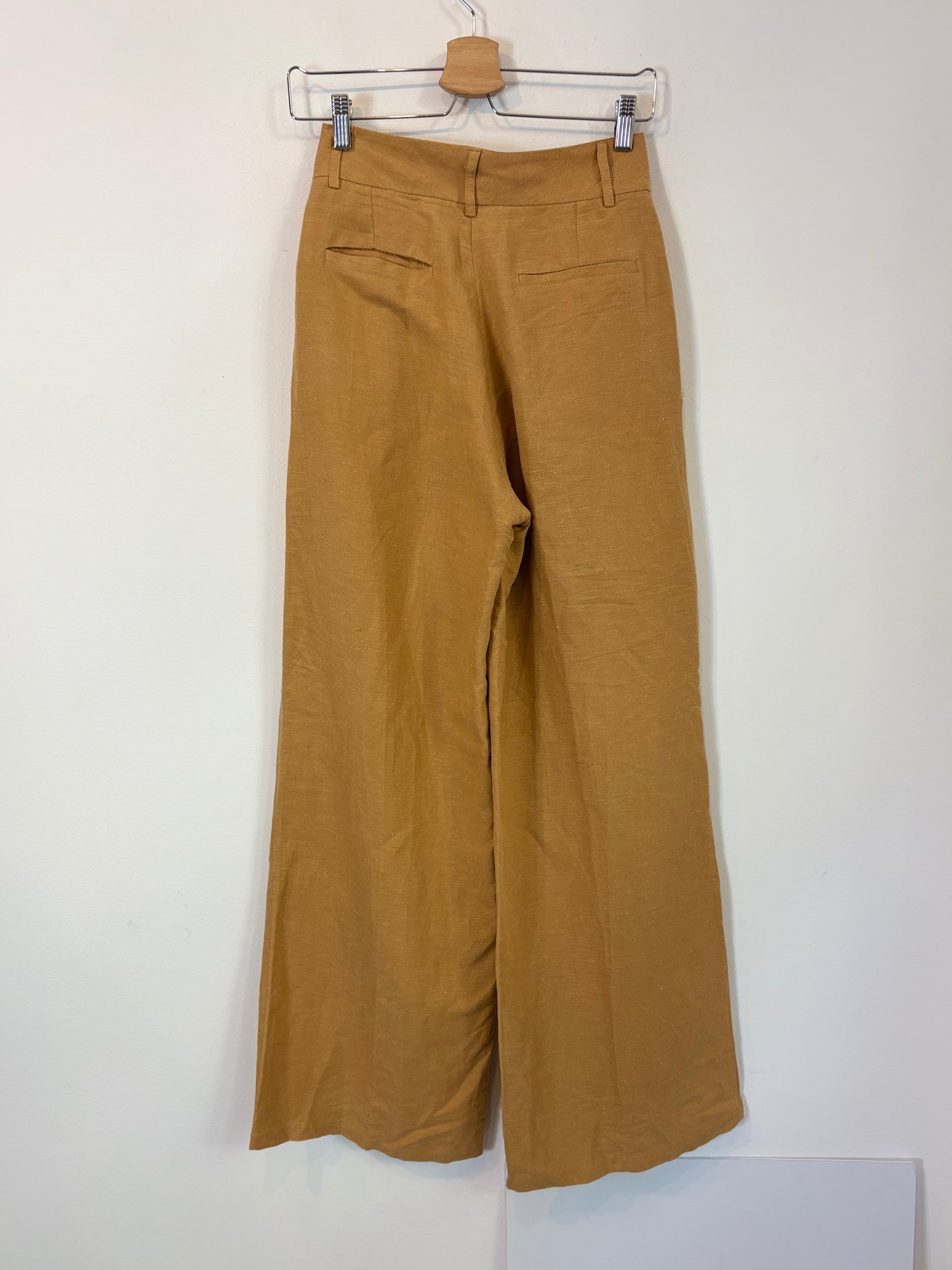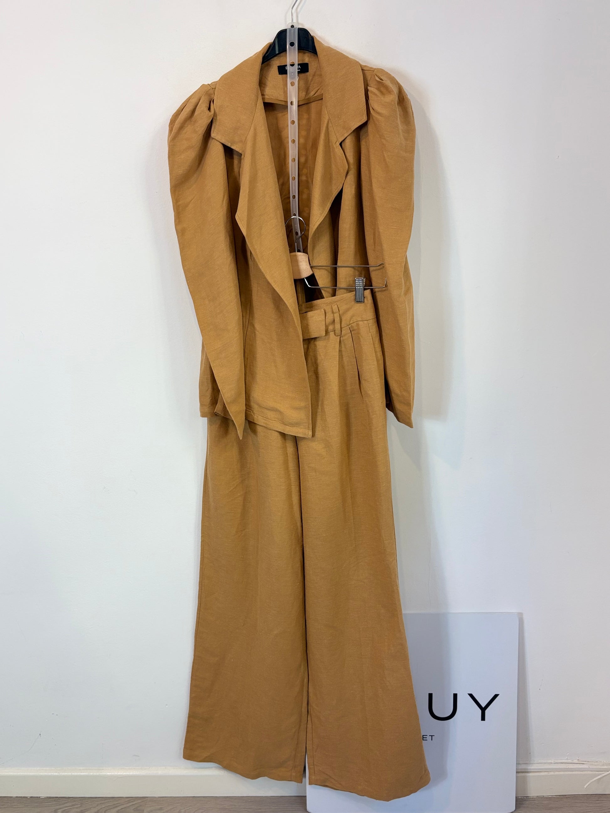 Camel-textured jacket and pants set. Jacket: 45 cm from armhole to armhole, length 70 cm. Pants: waist 35 cm, length 114 cm. Minor stain near the zipper. Tare: back pocket seam unstitched.