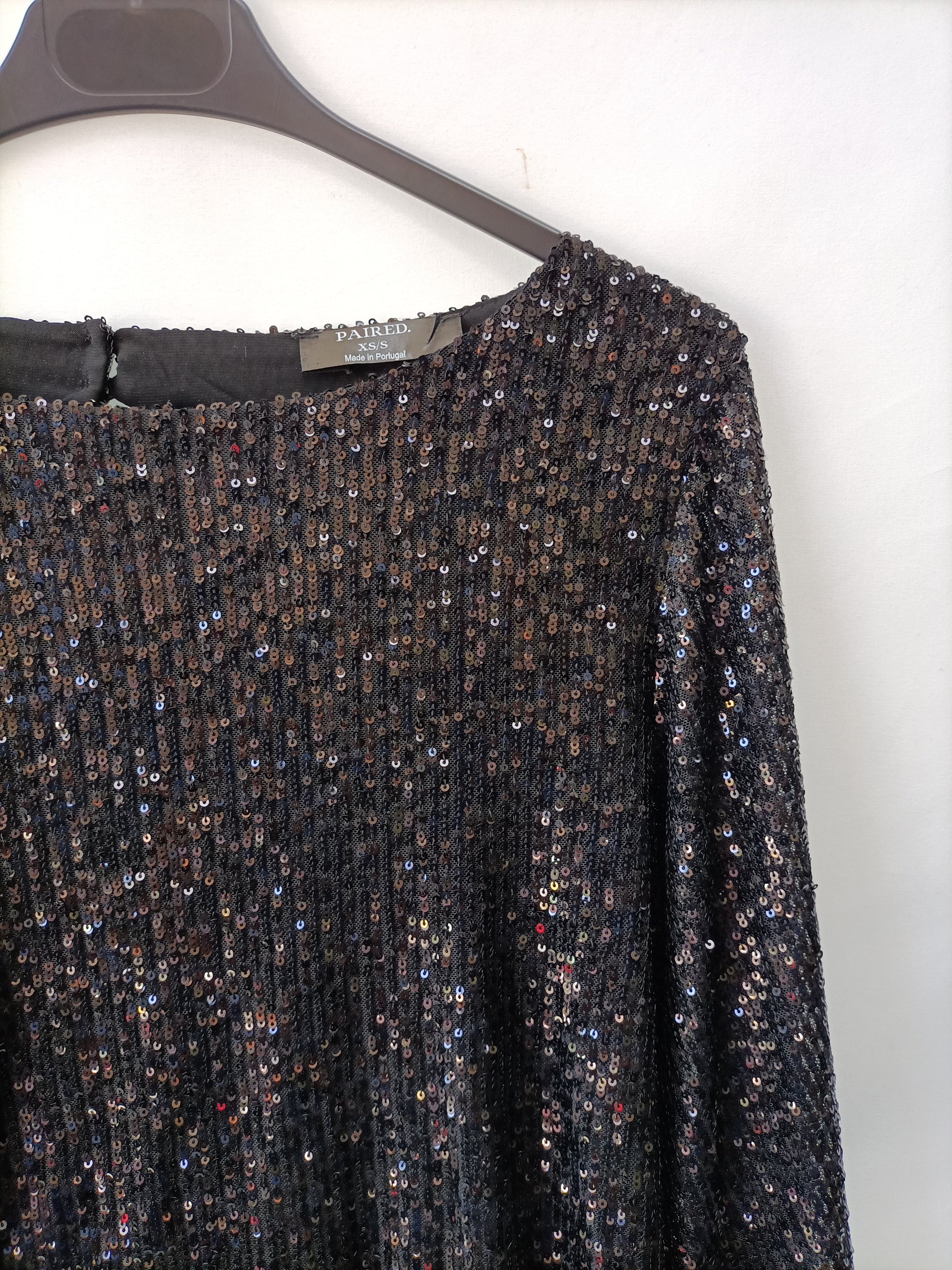 Black sequin top with open back and flared sleeves. Length 45cm.