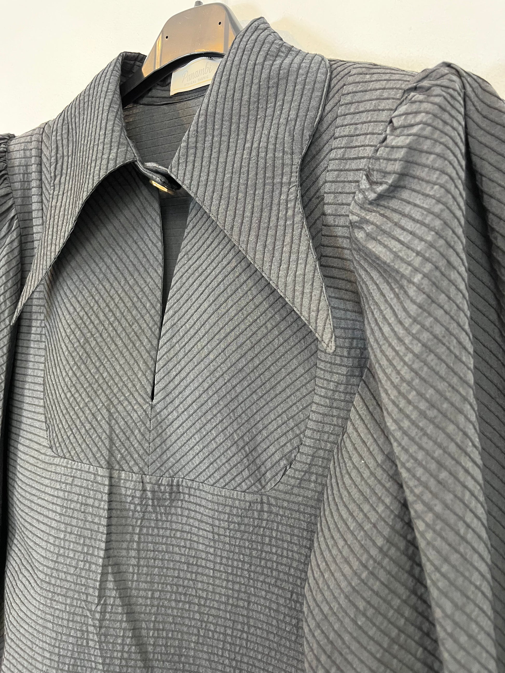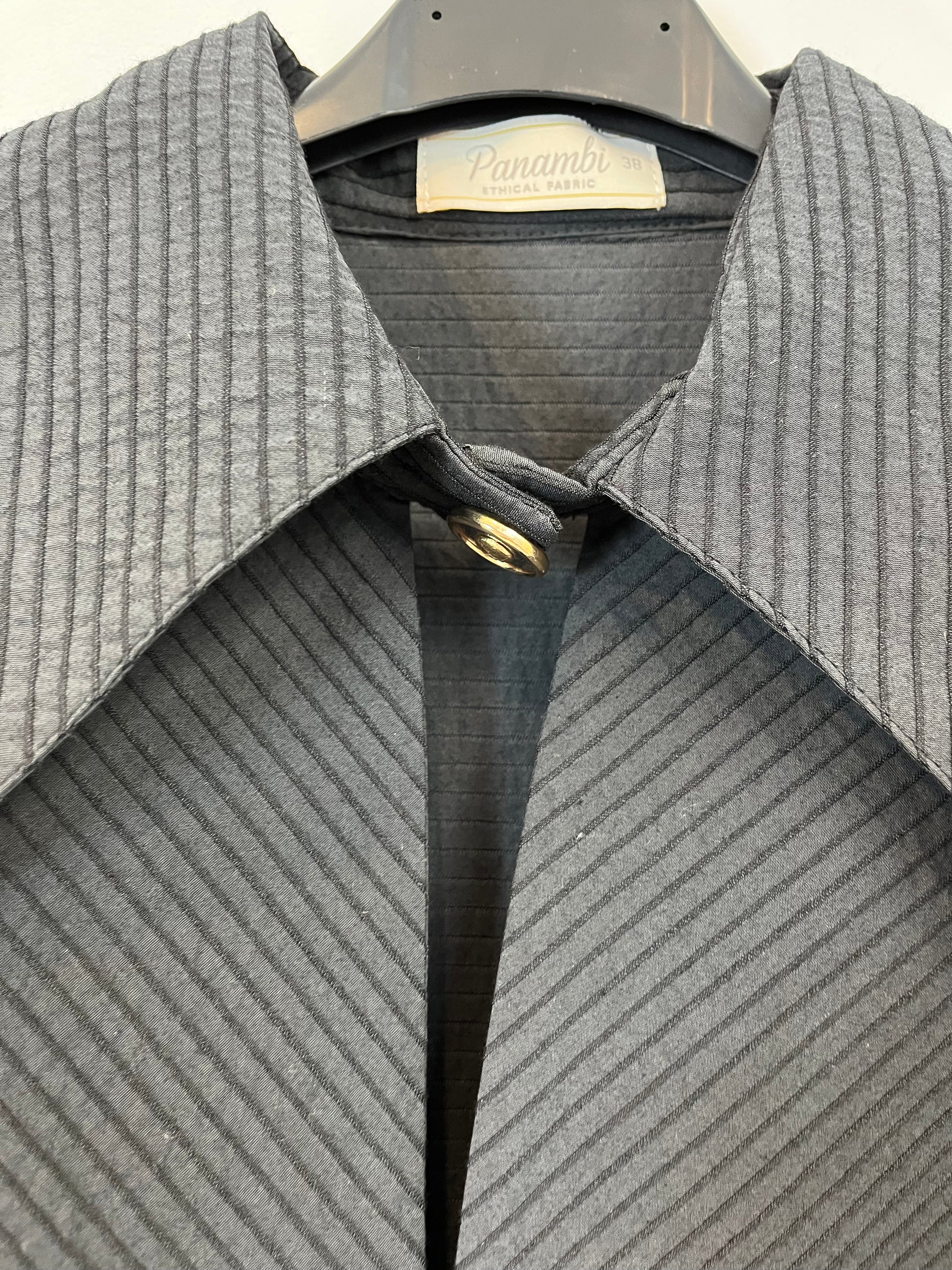 Black blouse in textured striped fabric. It has shoulder pads. From armhole to armhole 44 cm and length 58 cm.