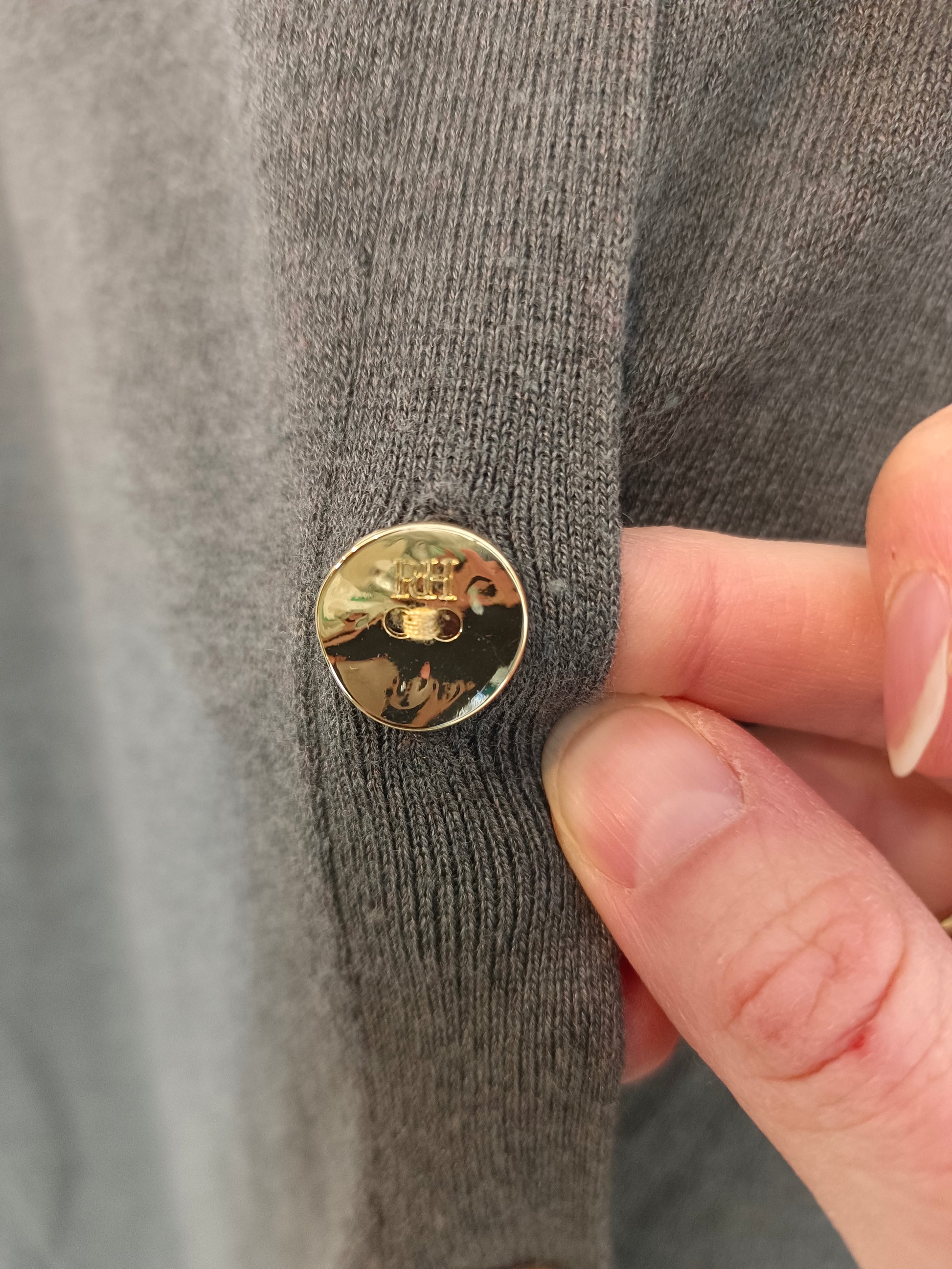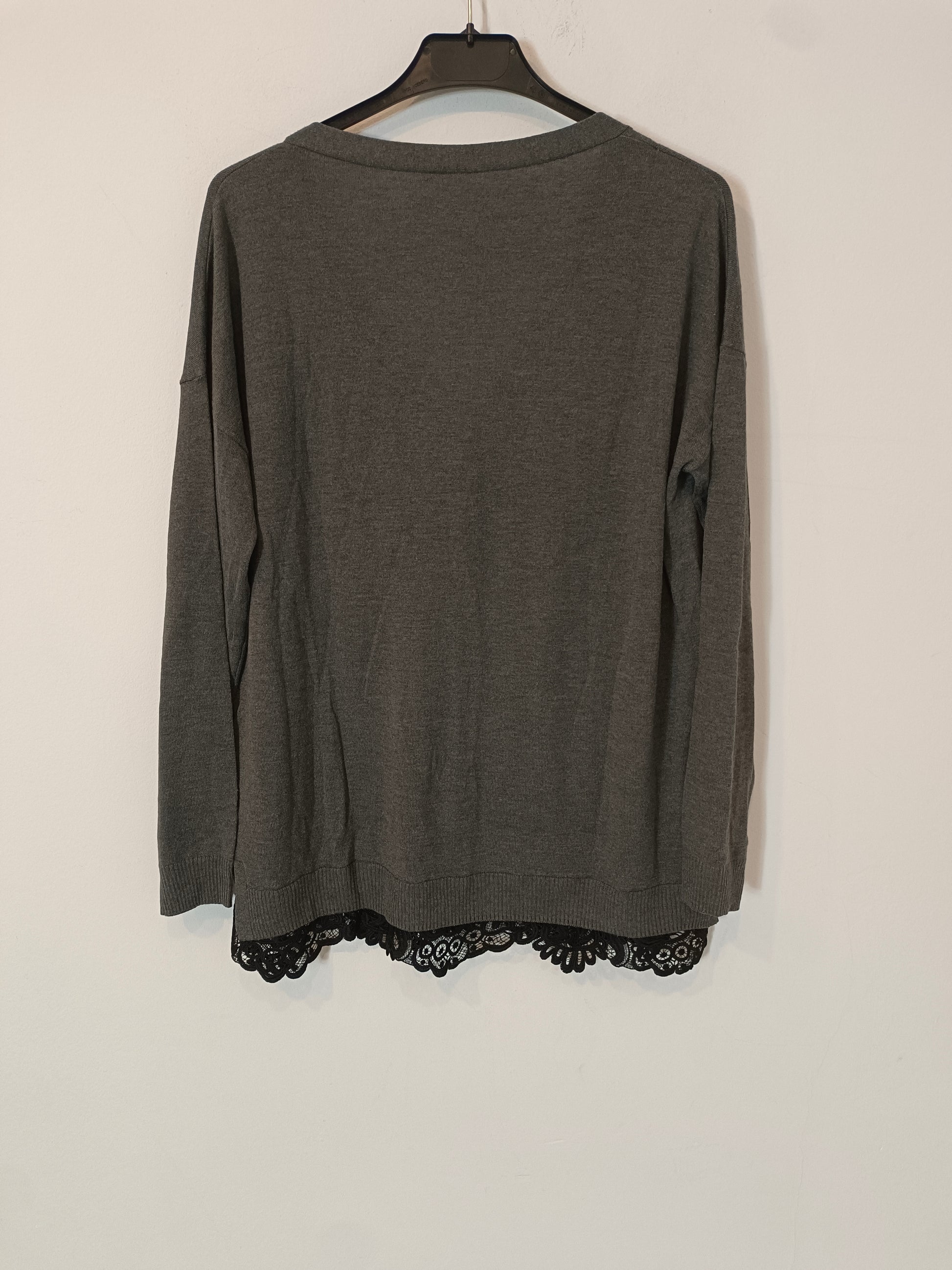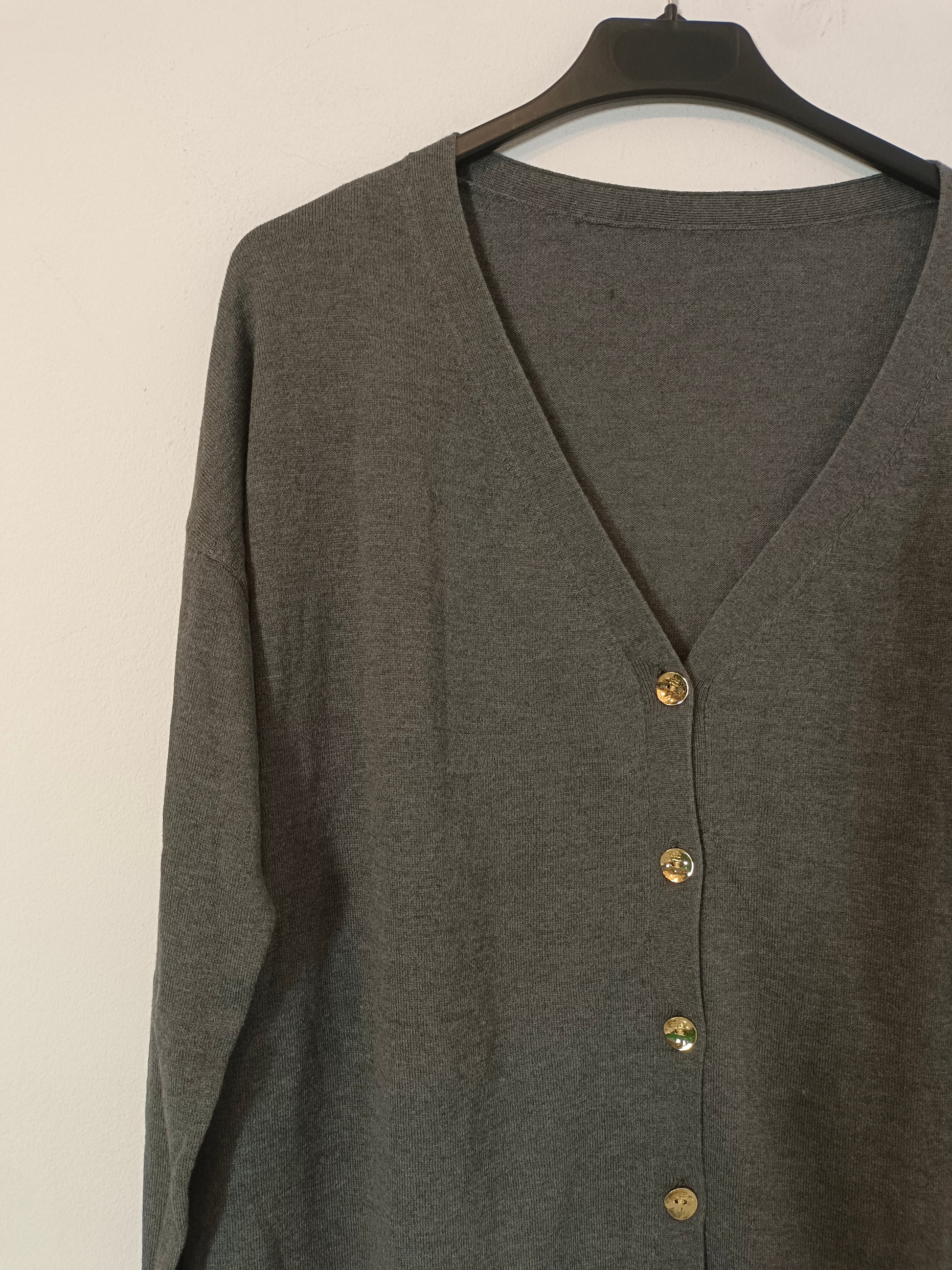 Gray button-down cardigan with gold buttons and lace details. Length 68 cm.