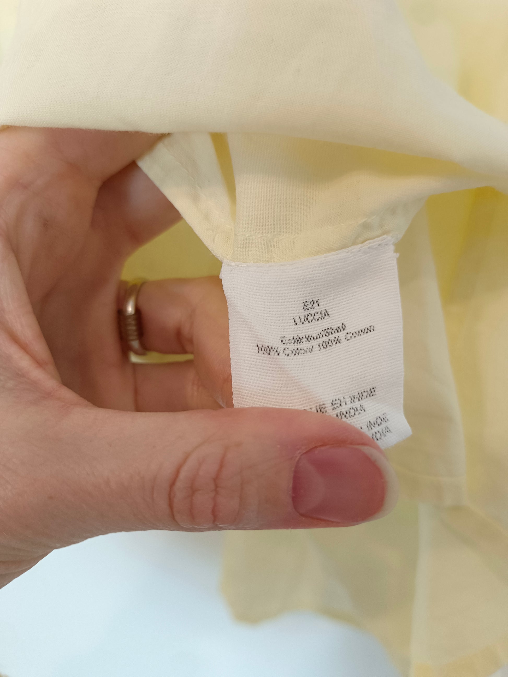 blusa amarilla fluida con el cuello bordado y troquelado. de sisa a sisa 49 cm largo 54 cm