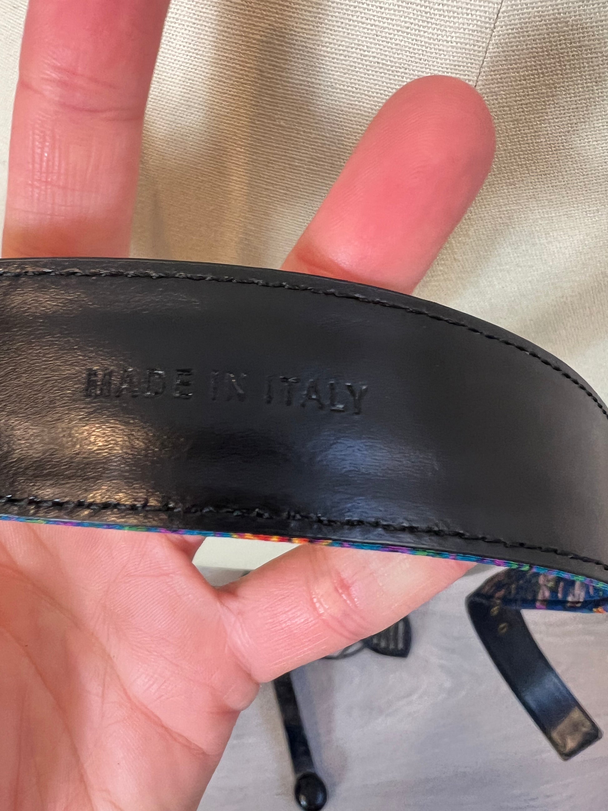 PHILOSOPHY OF LORENZO SERAFINI. Leather belt lined with printed fabric. Size 44 (M)