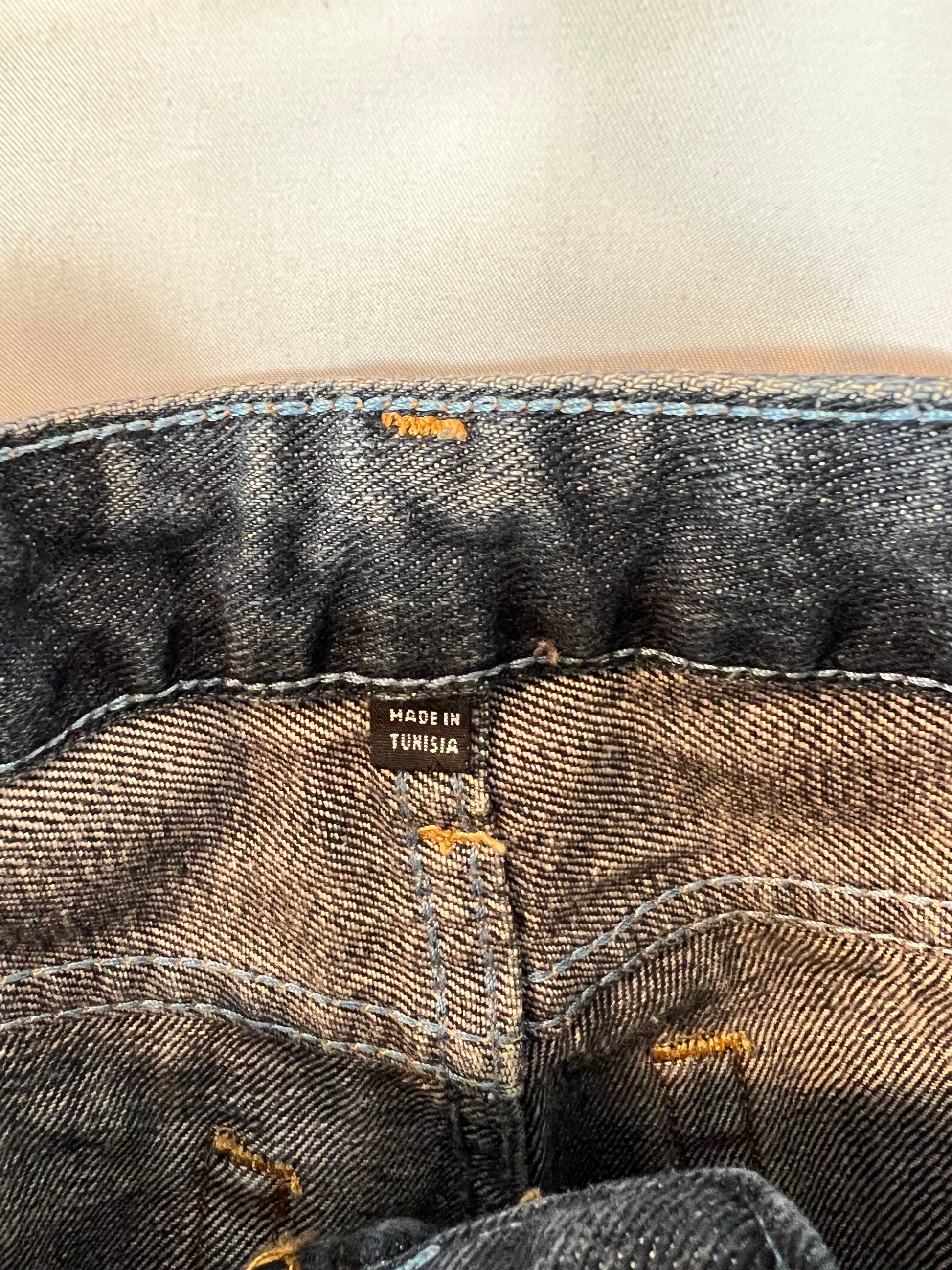 Denim recto oscuro no elástico cintura media. cintura 41cm, largo 102cm