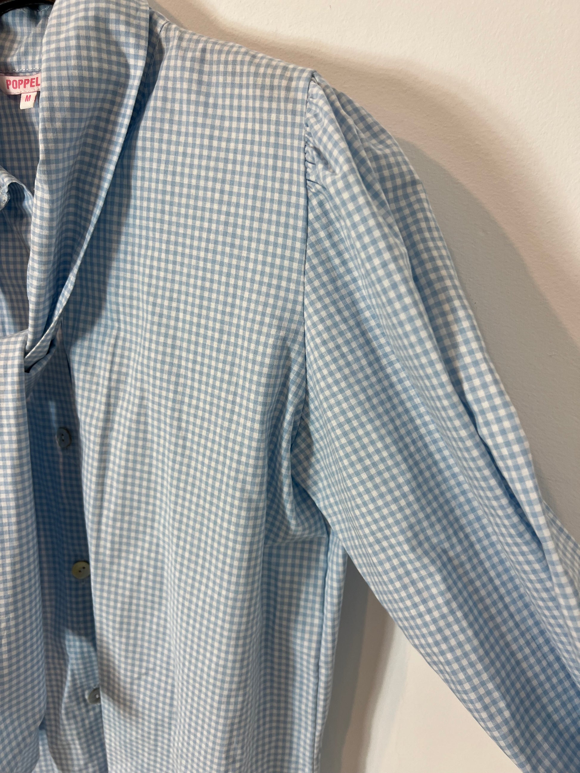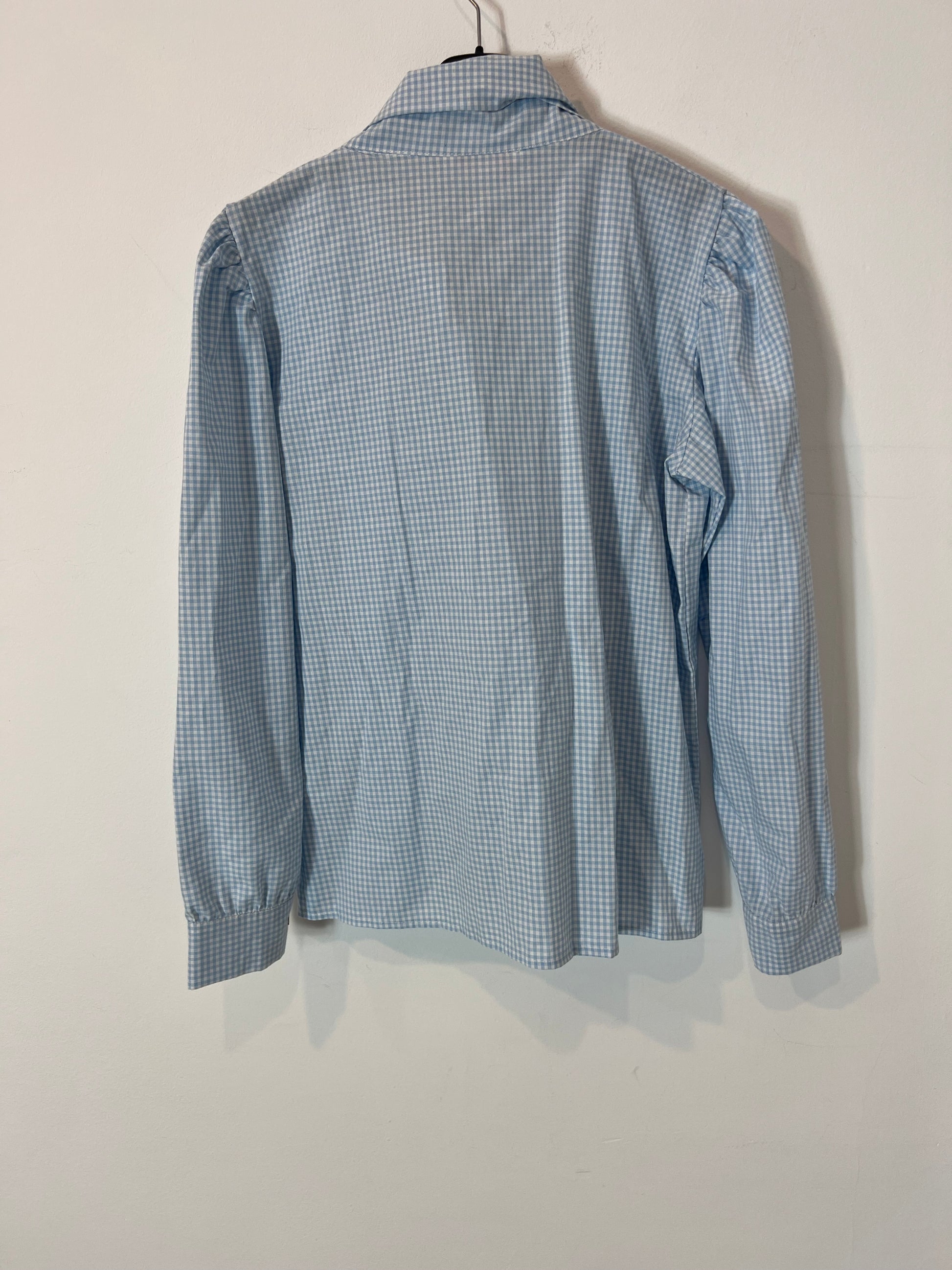 Flowy blue and white checked blouse with a bow at the neck. 50cm from armhole to armhole, 61cm long.