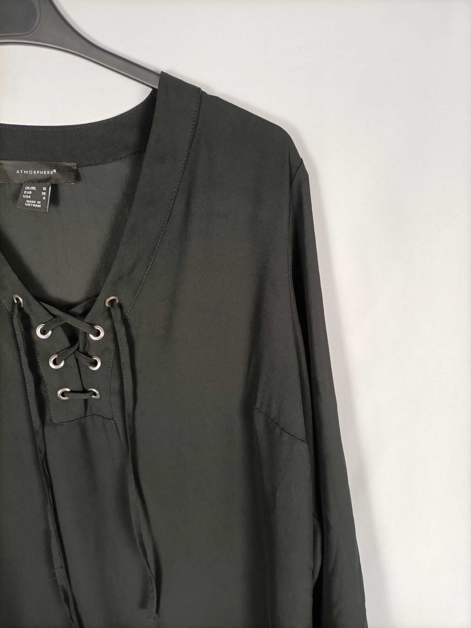 Primark.38. Flowy, sheer black blouse with a rope detail at the neckline. Semi-sheer. Armhole to armhole 48 cm, length 68 cm.