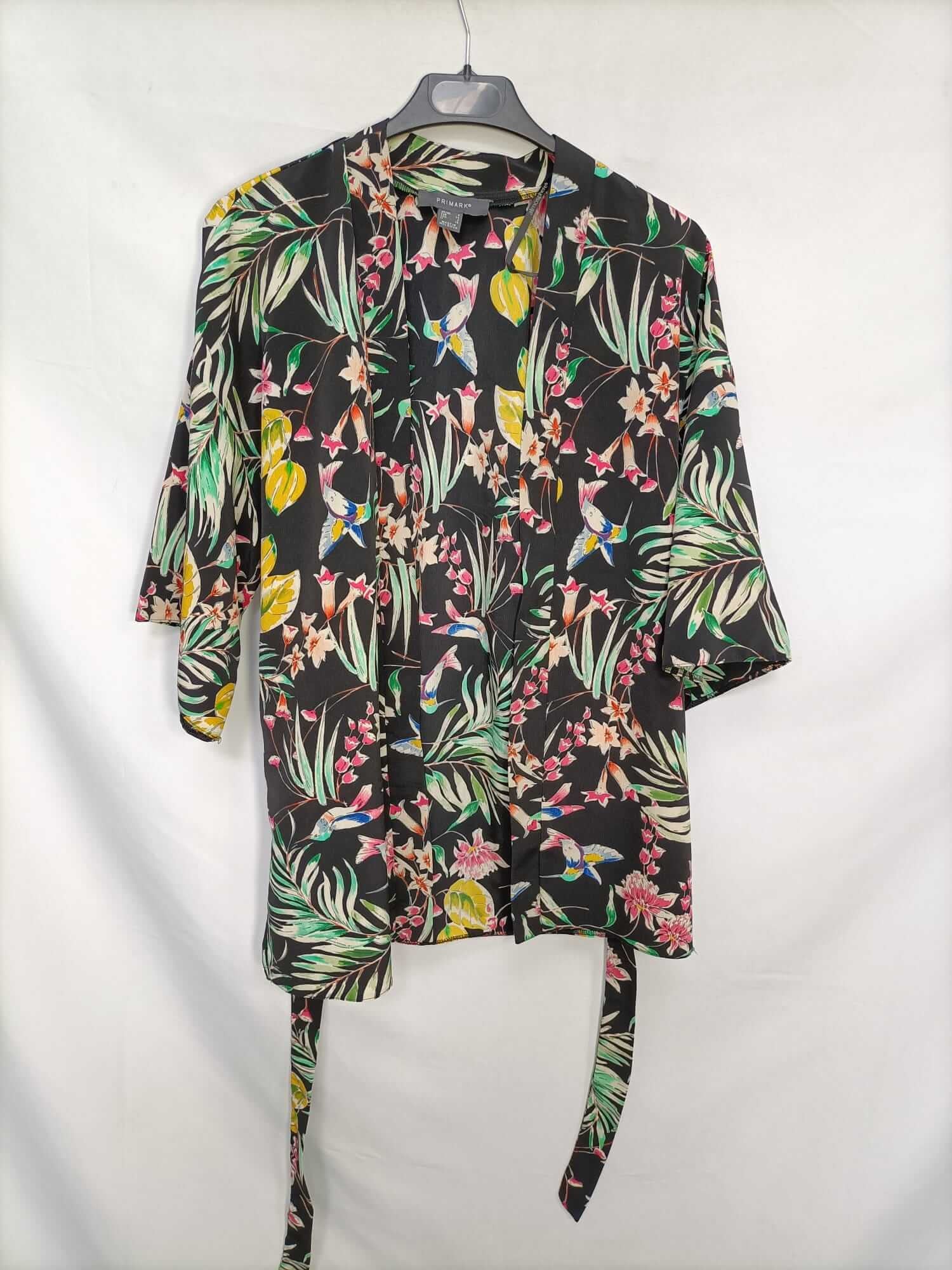 Primark. 34. Black floral print wrap blouse/blazer. 3/4-length sleeves. Fastens with a crisscross bow. 55 cm from armhole to armhole, 75 cm long.