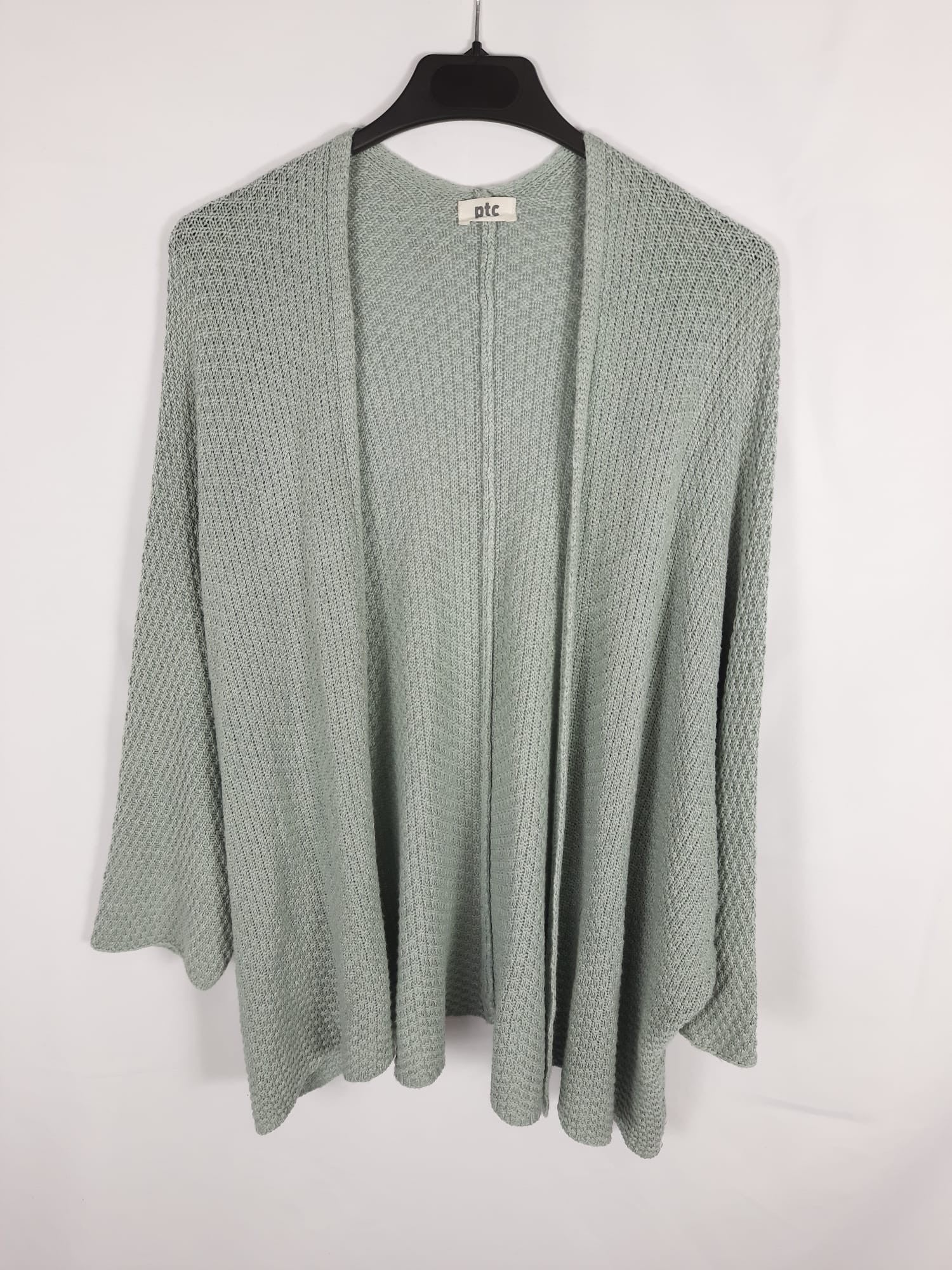 PTC. Flowy knit teal cardigan. Wide sleeves. Unbuttoned. Length 68 cm.