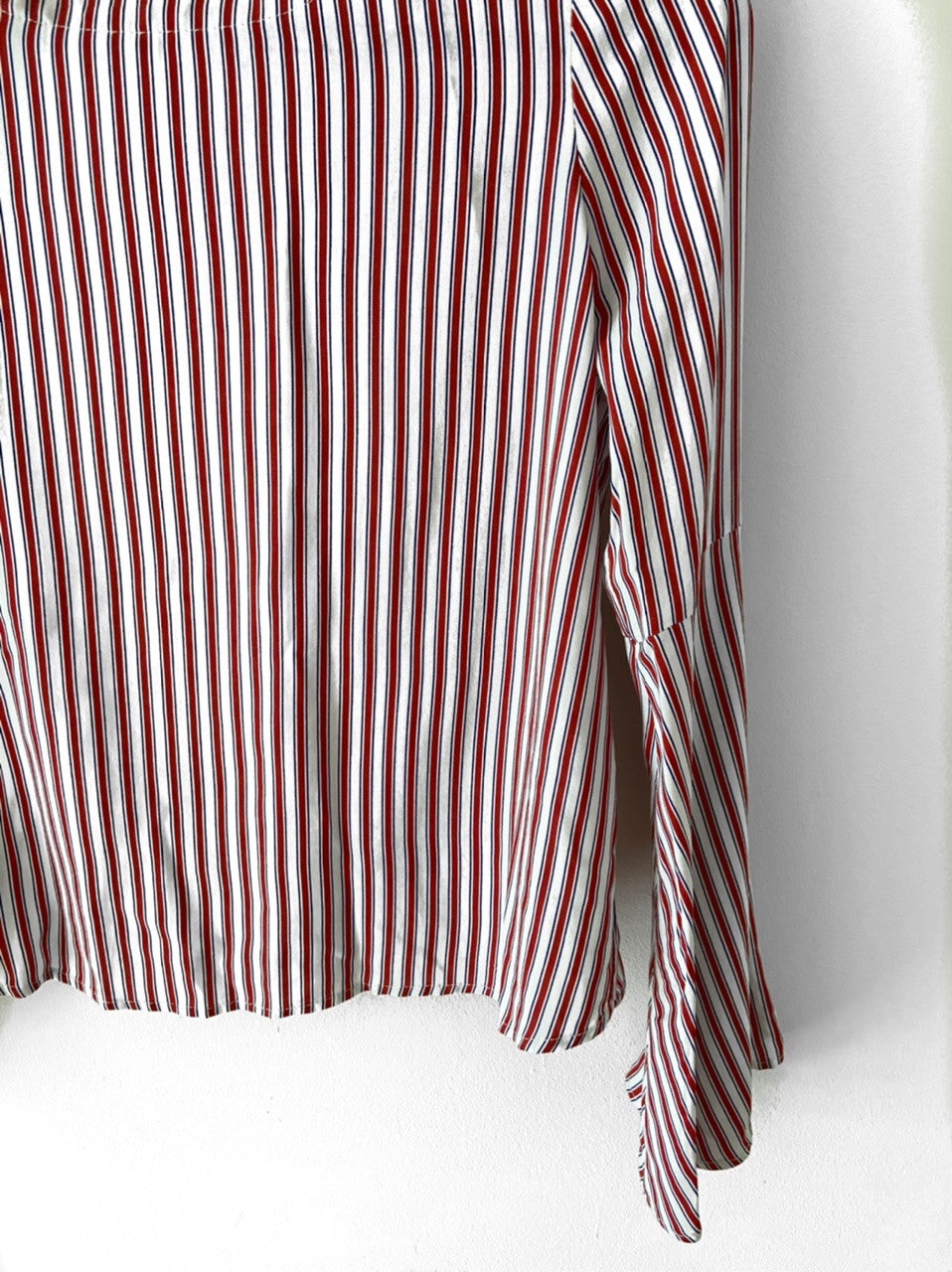 Short, flowing blouse with red and white stripes and flared sleeves