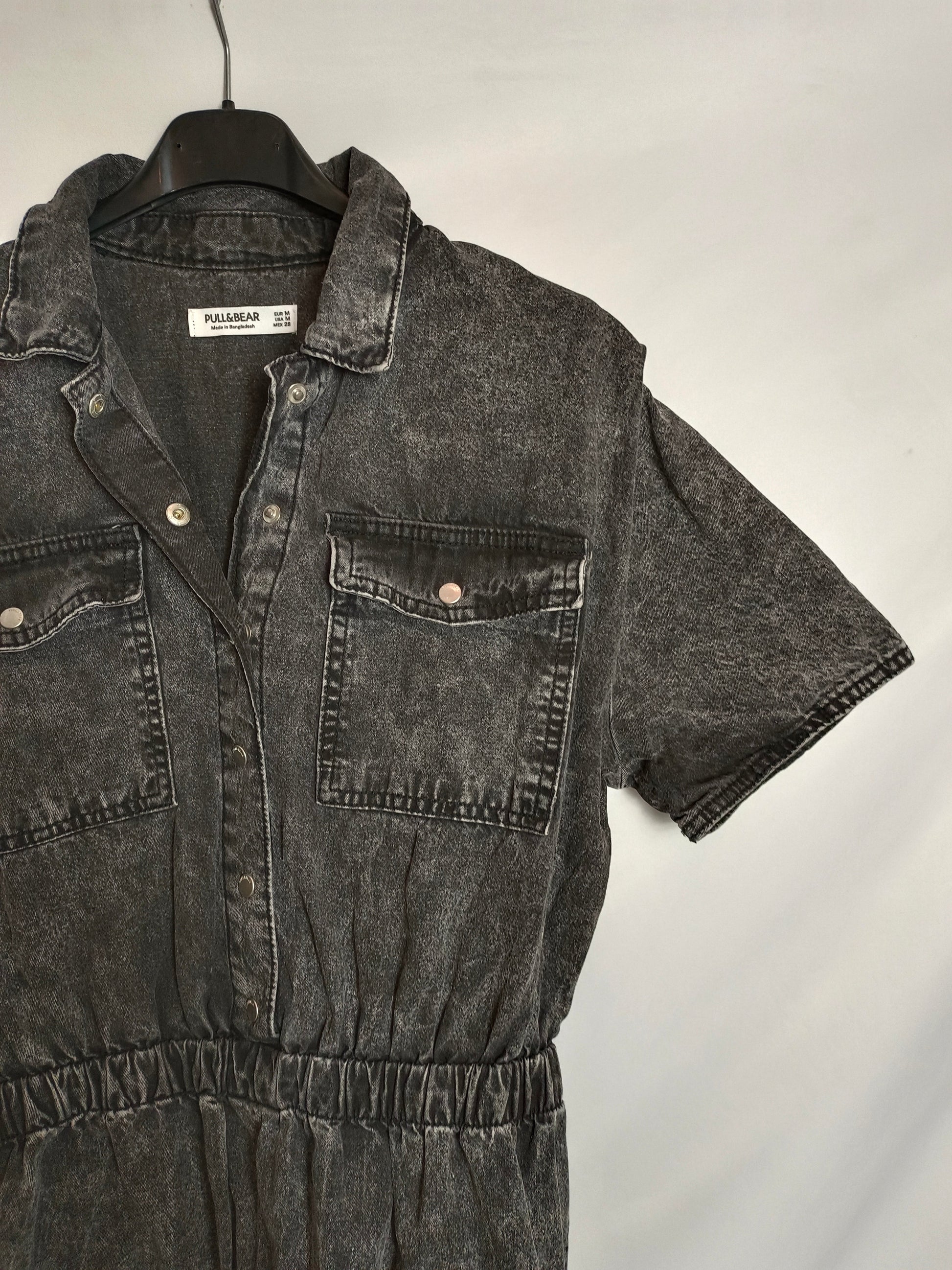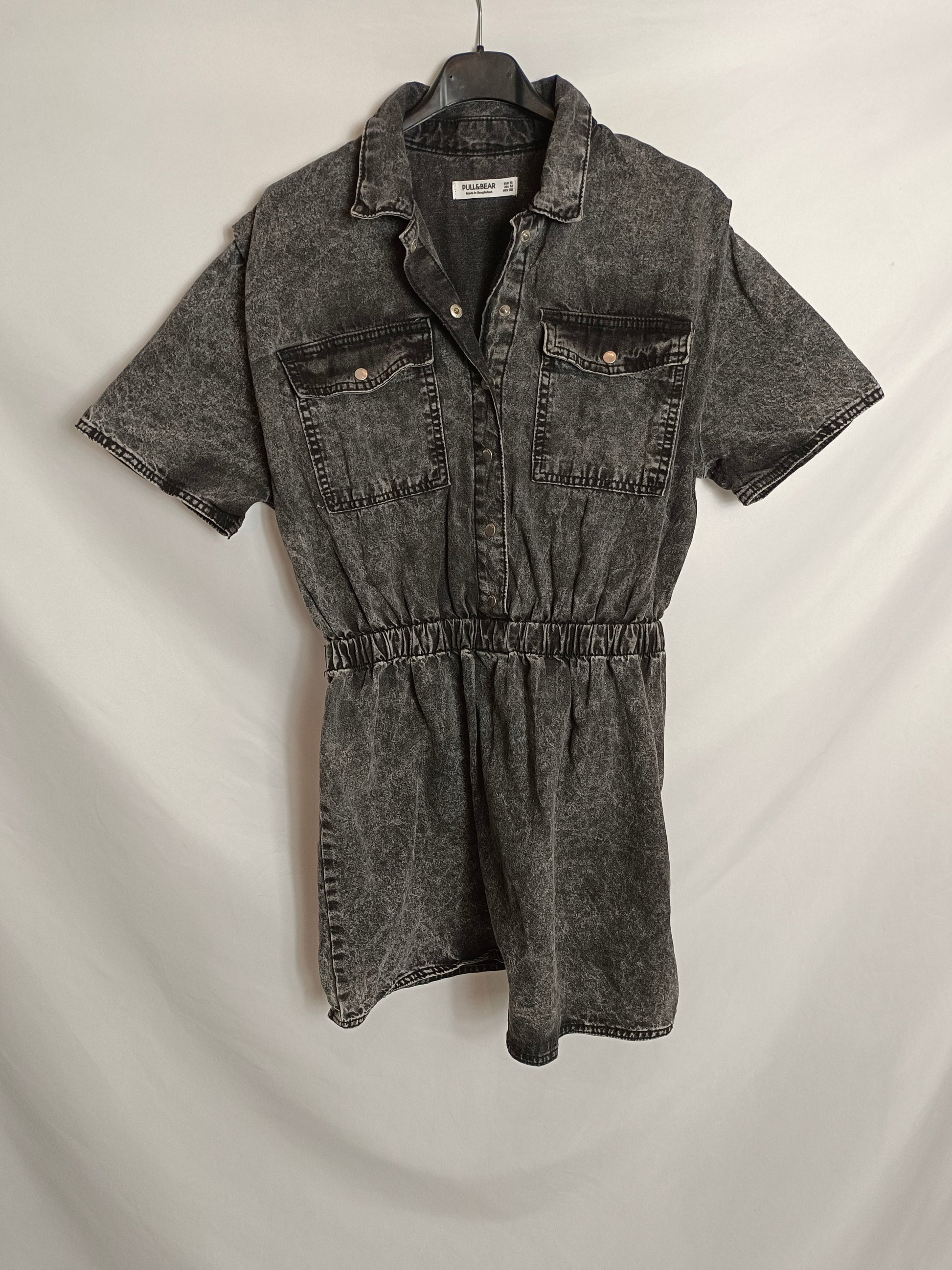 Vestido corto denim de tejido desgastado. Cintura elástica.