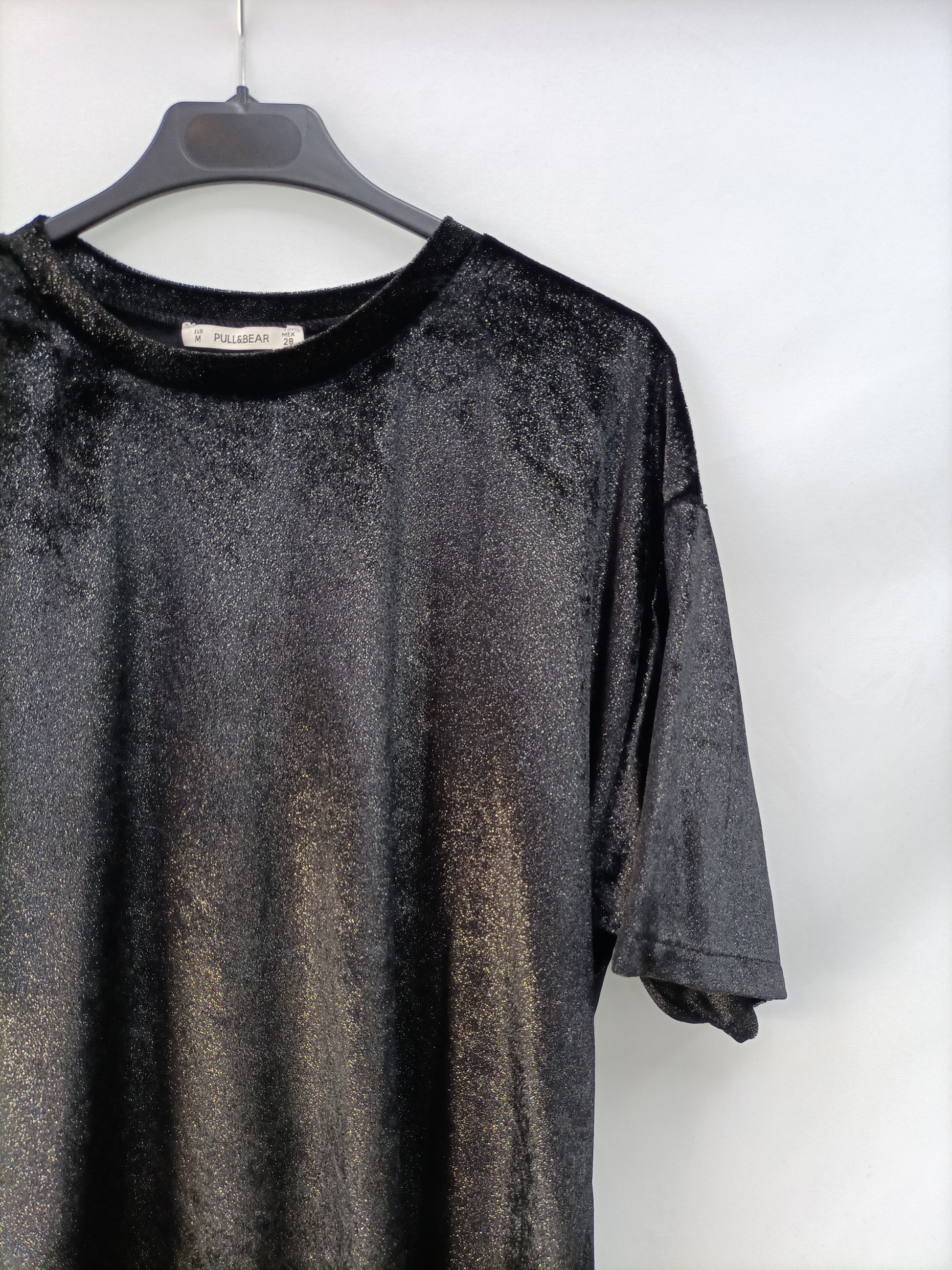 Pull&bear. Black velvet dress with gold glitter. Stretchy and flowing. Length 81 cm.