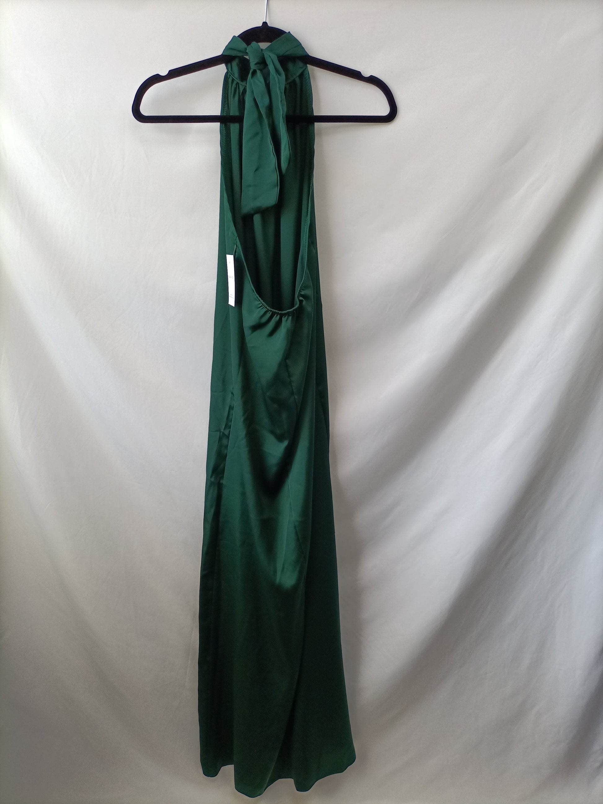 NEW WITH TAG. Lake green dress with side slit. Halter neck with bow and open back. Length 149 cm.