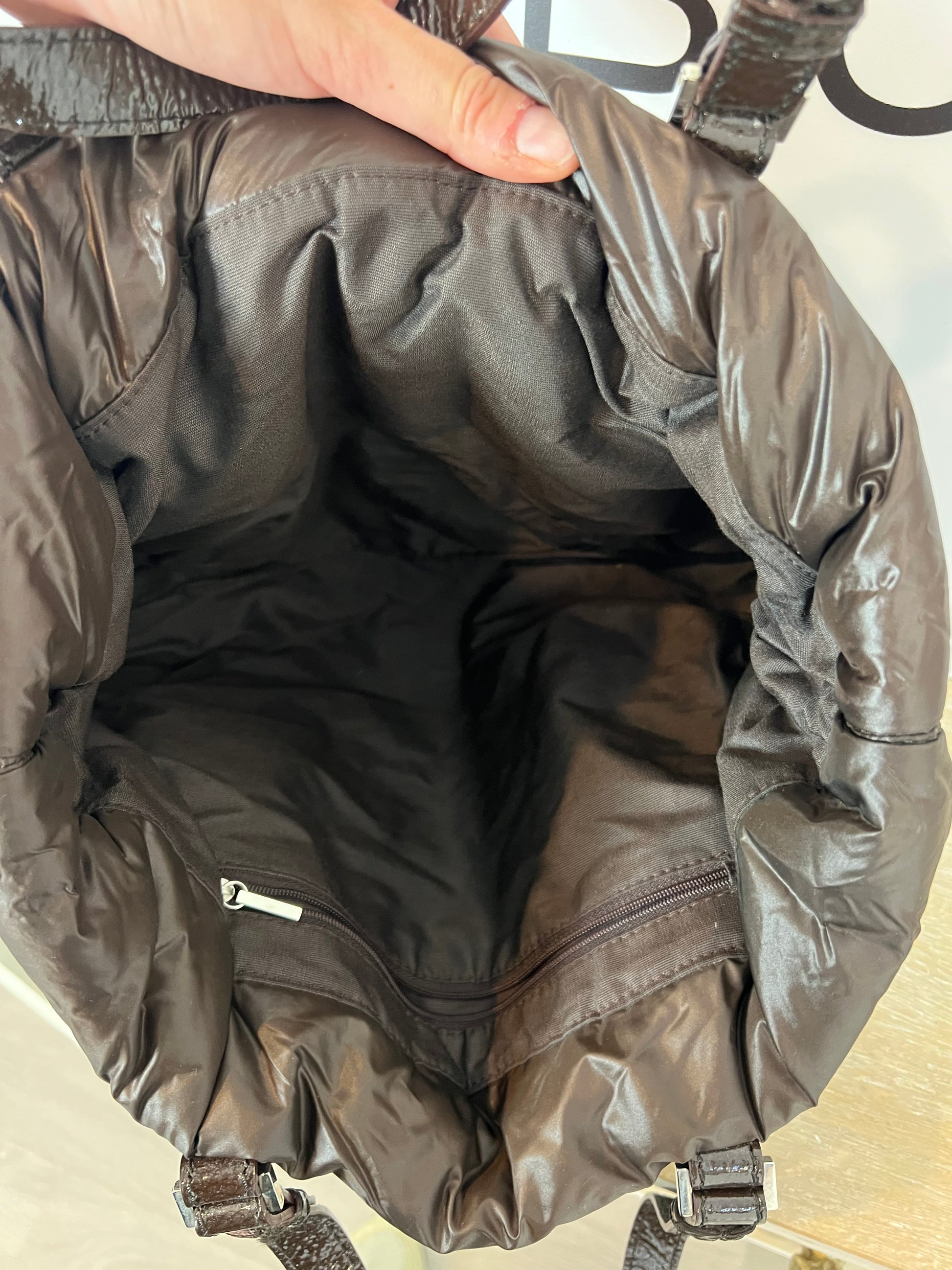 Medium brown quilted bag with logo detail. Height 28 cm, width 38 cm.