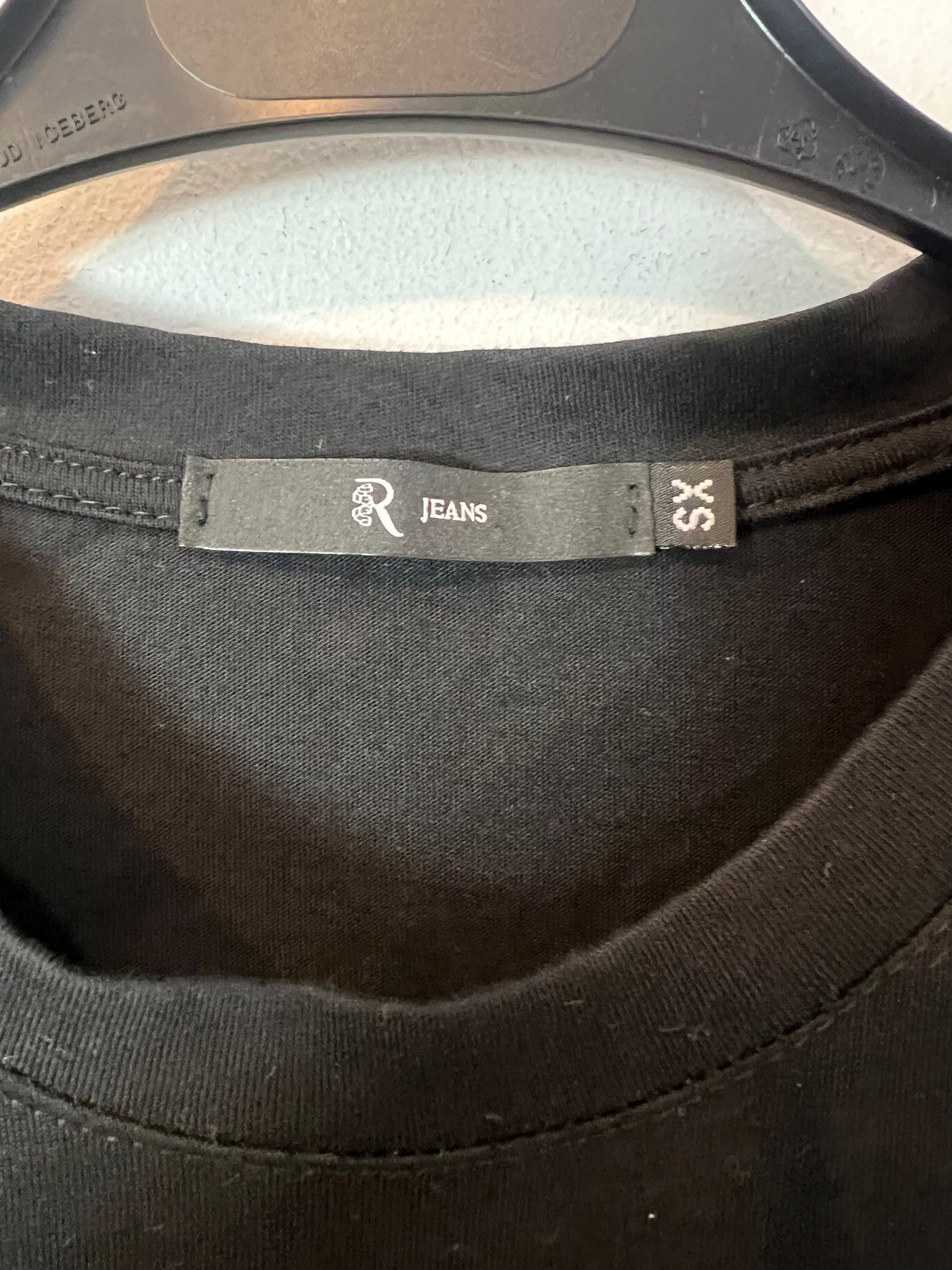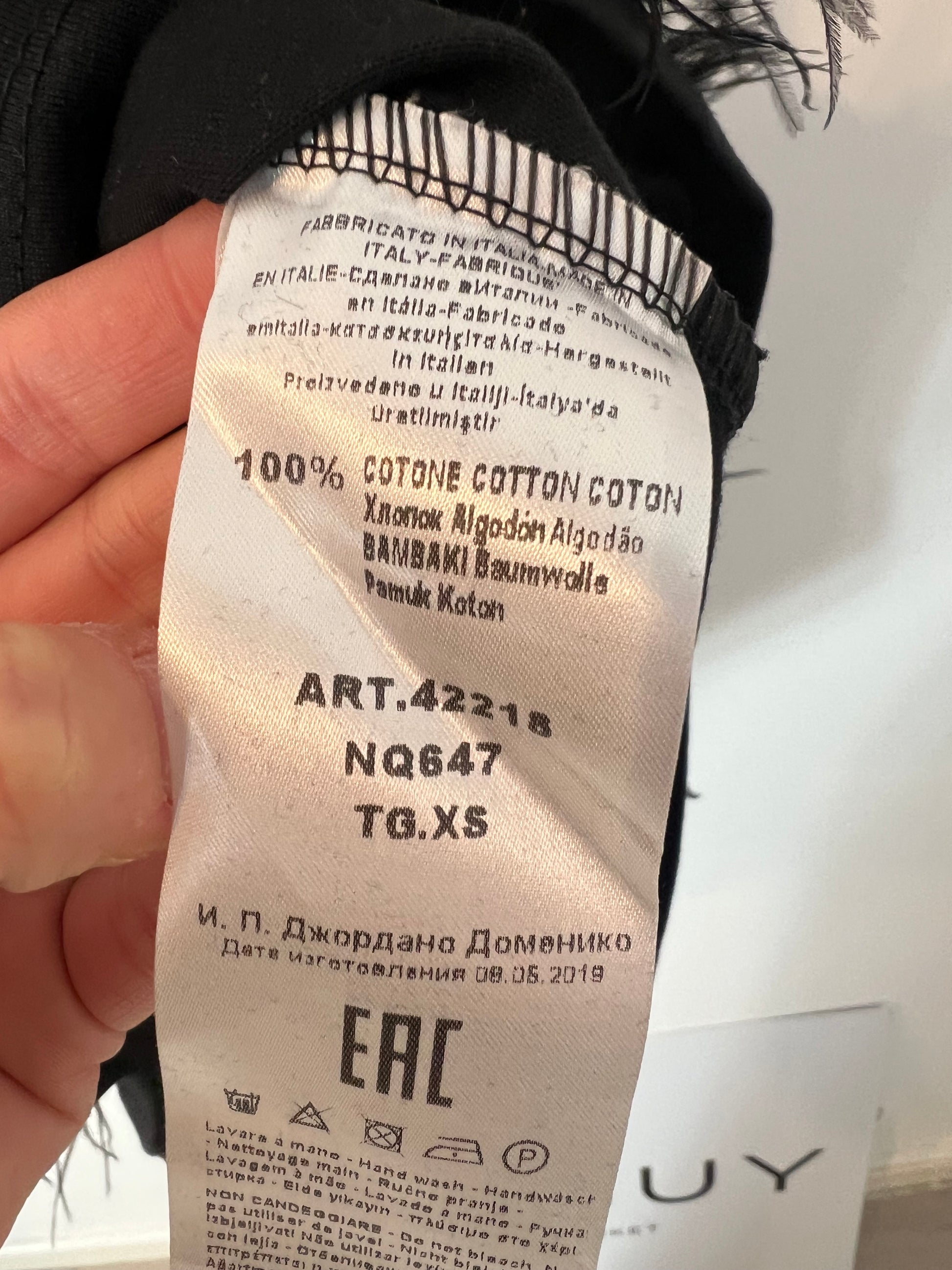 Black woven T-shirt dress with feathers and shoulder pads. Back 45cm, length 76cm