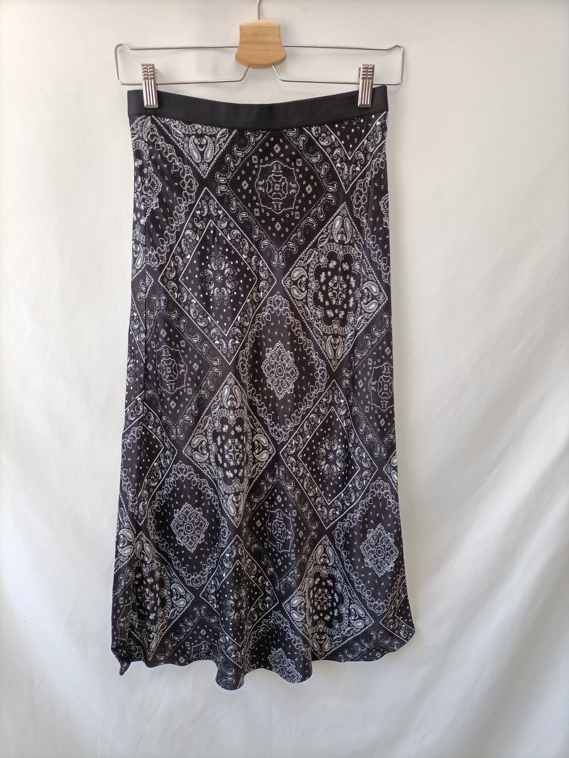 Rails. Black mido skirt with amoeba print. Elastic waistband and silk-like fabric. 82 cm long.