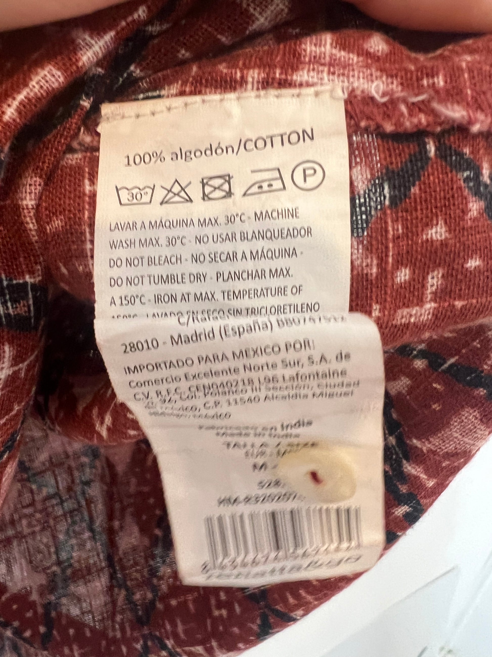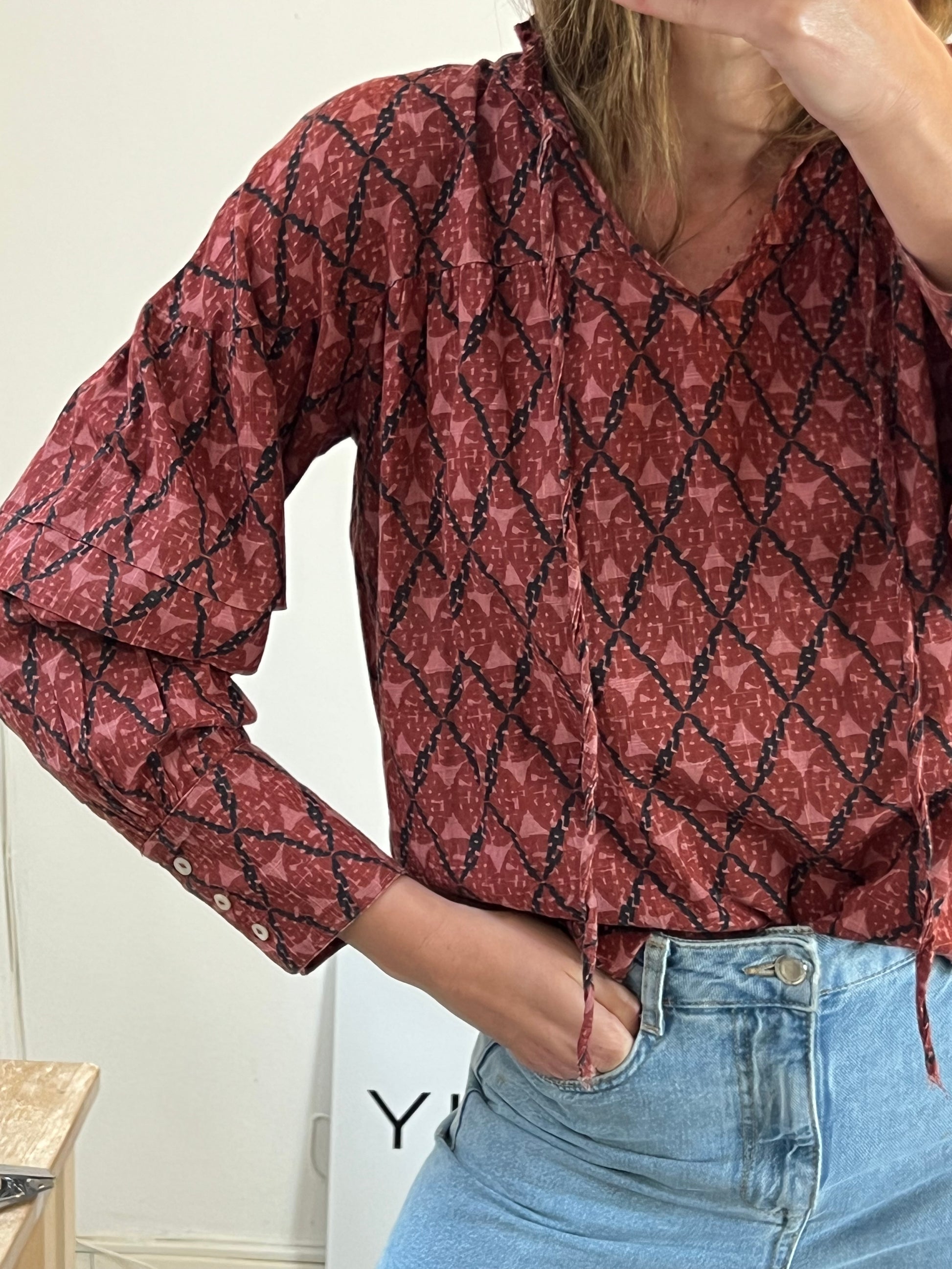 Printed burgundy blouse. 100% cotton. Length 64 cm.