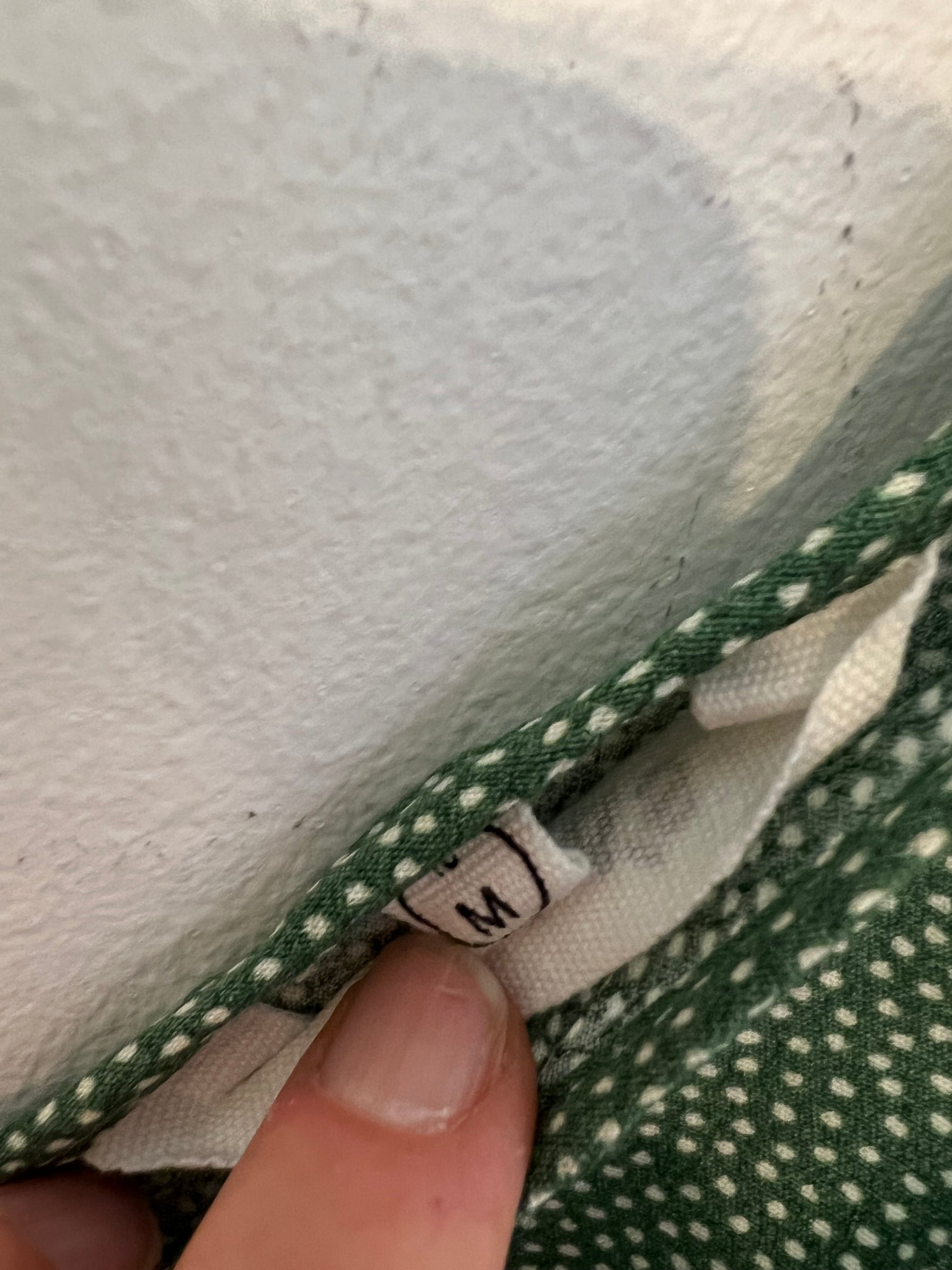 Short green polka dot dress. V-neck. No stretch. 46 cm from armhole to armhole, 92 cm long, 37 cm waist.