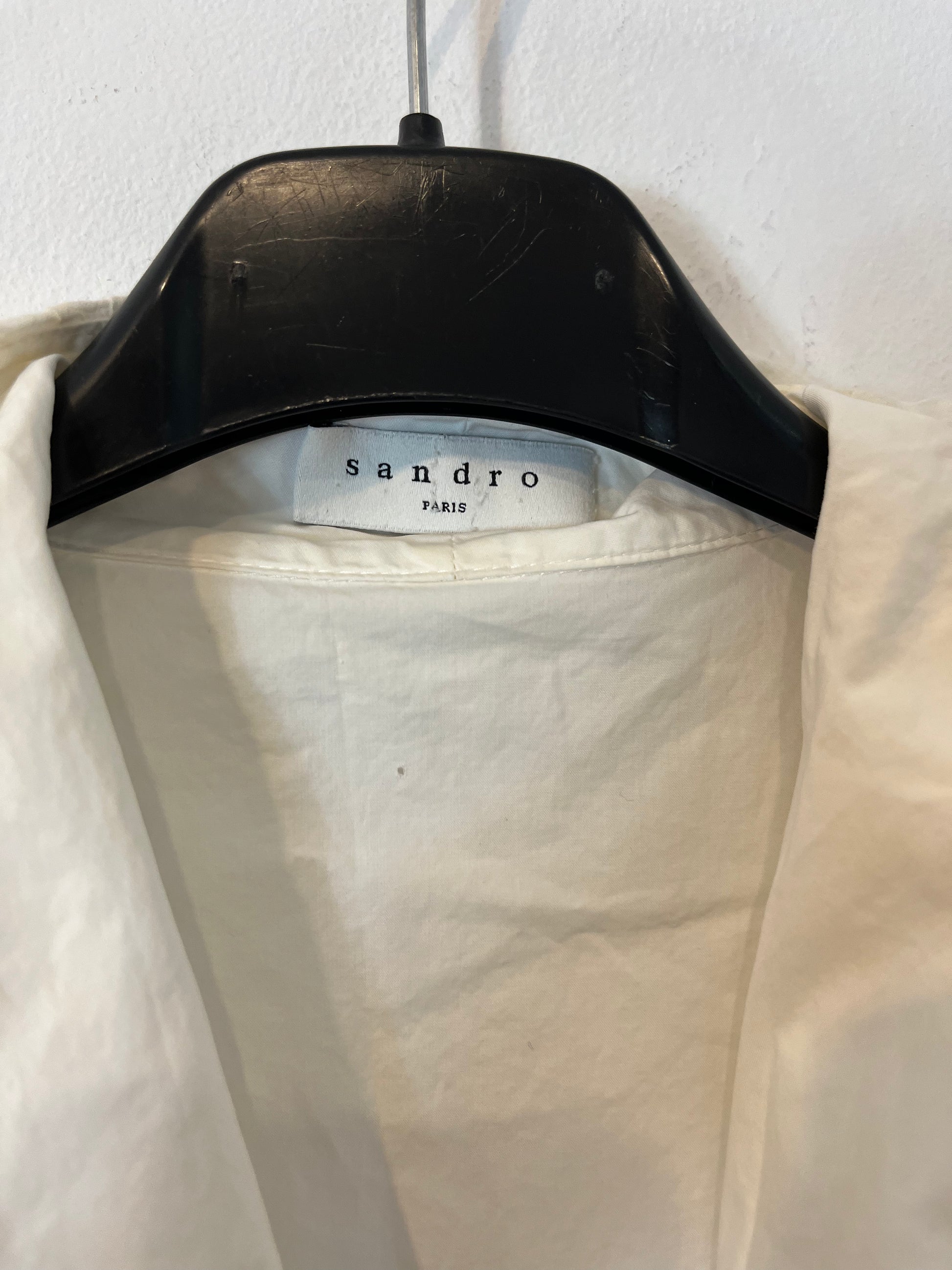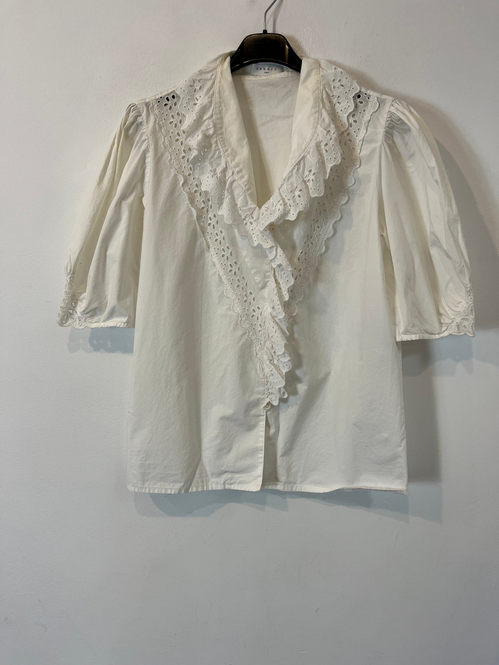 White blouse with die-cut details. Back 50 cm, Length 65 cm