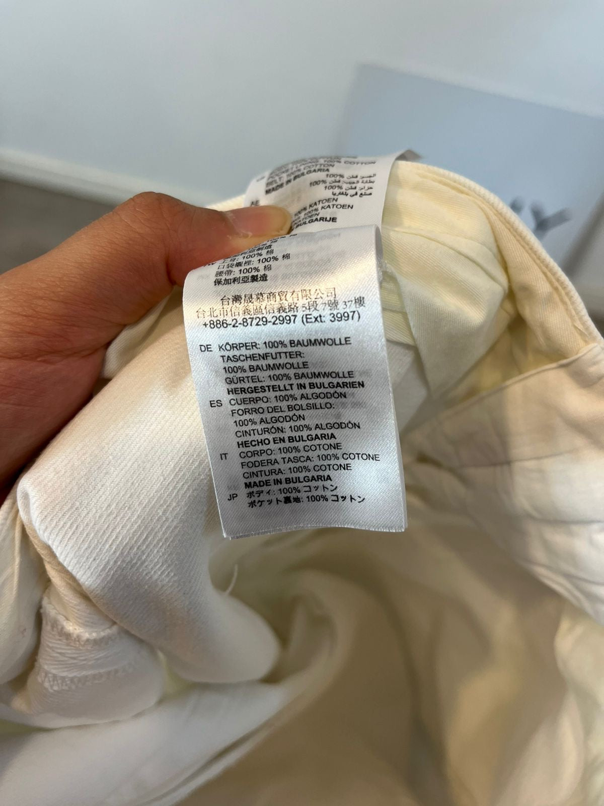 White denim with wide leg pleats. No stretch. Waist 38 cm, length 105 cm.