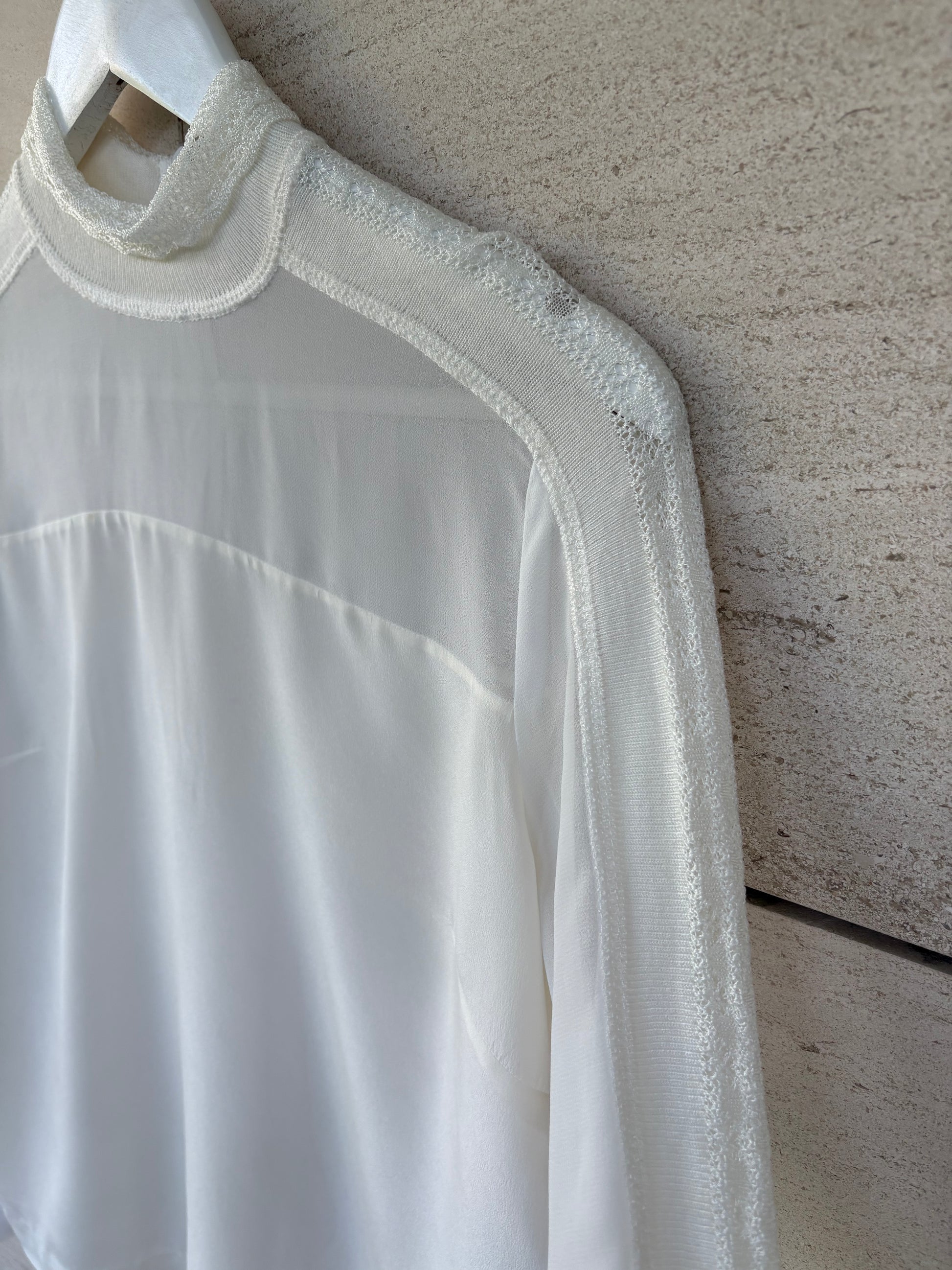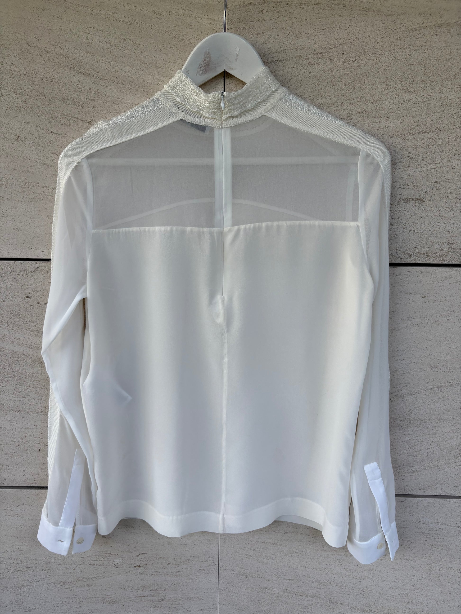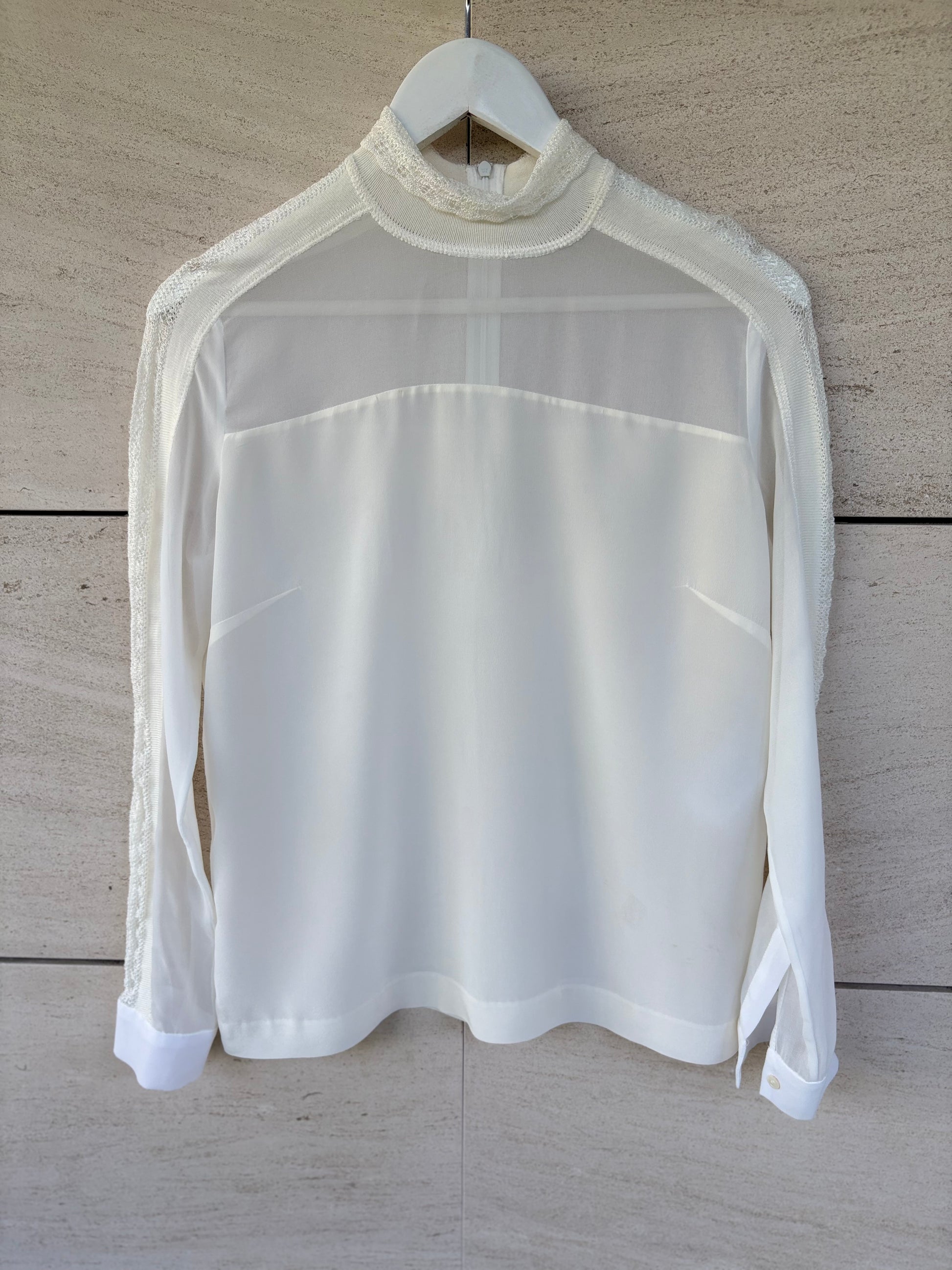 Blusa en blanco roto con seda y angas con hilo. No elástico. Espalda 49 cm, largo 61 cm