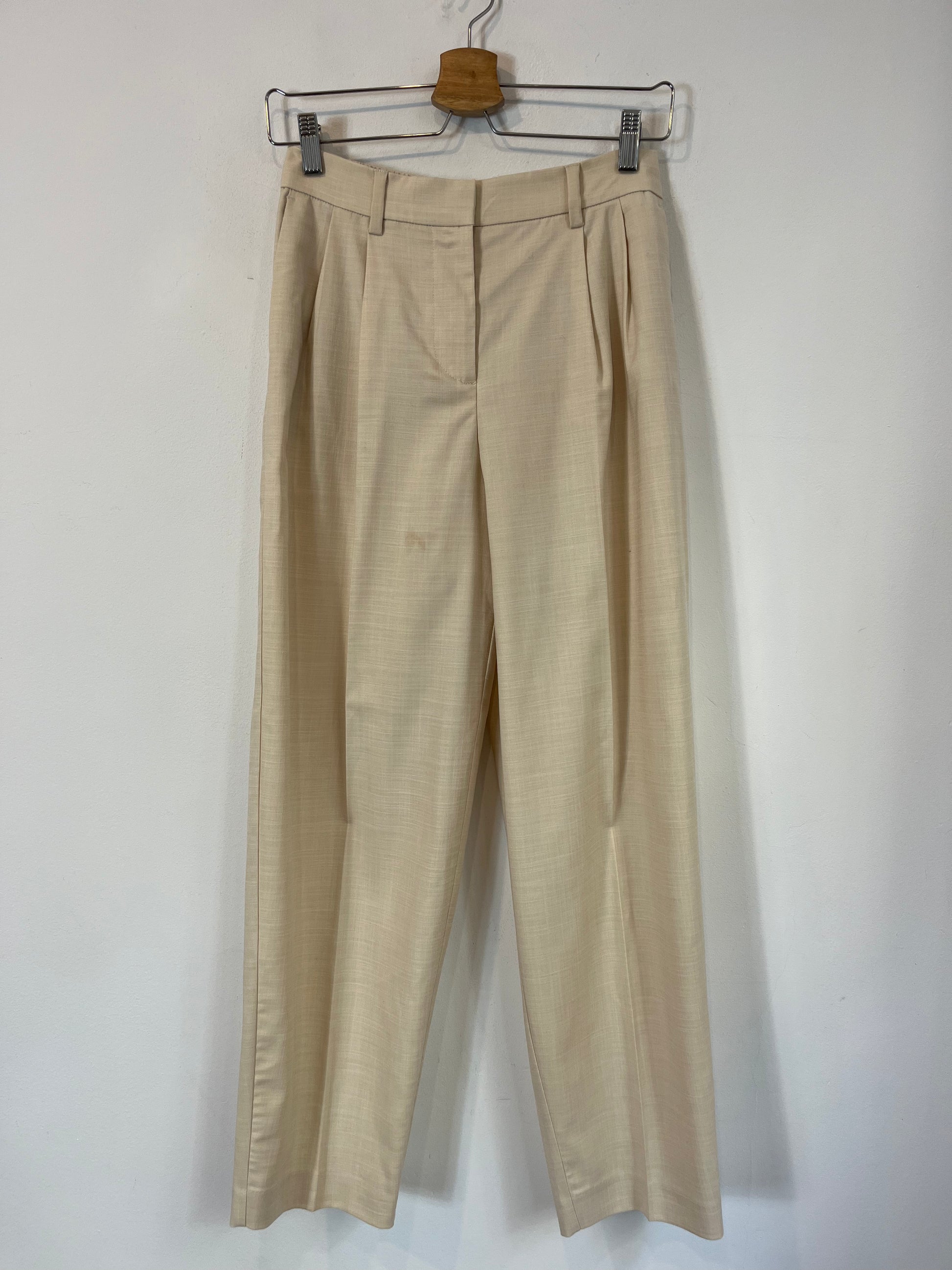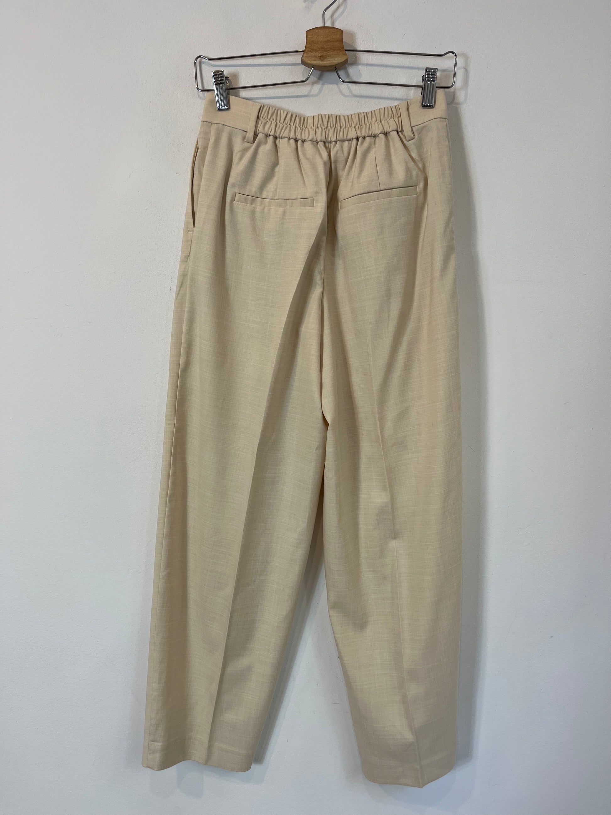 Beige flowy pleated trousers. Elastic waistband. Waist 35 cm, length 102 cm. Tare: small stain.