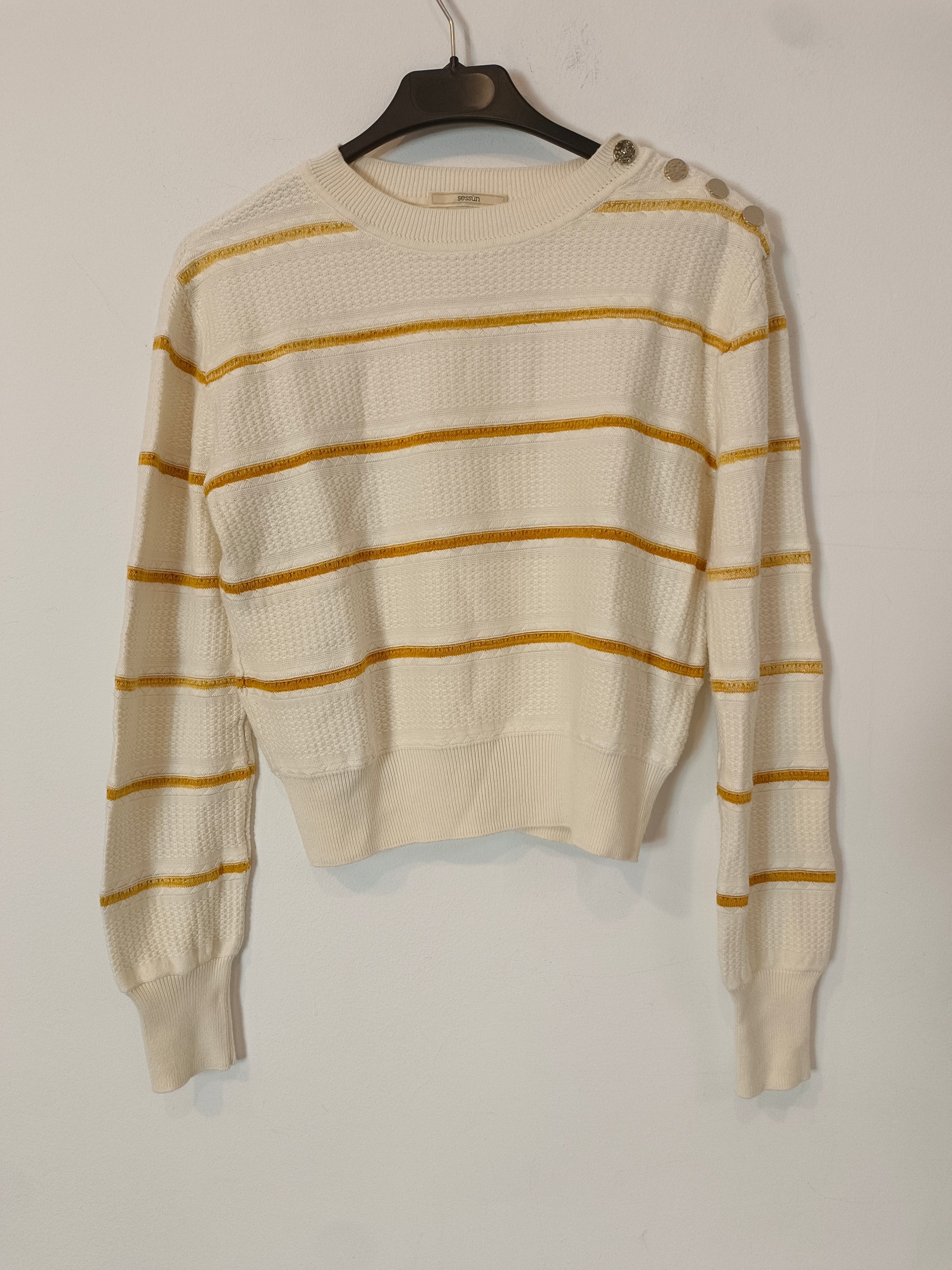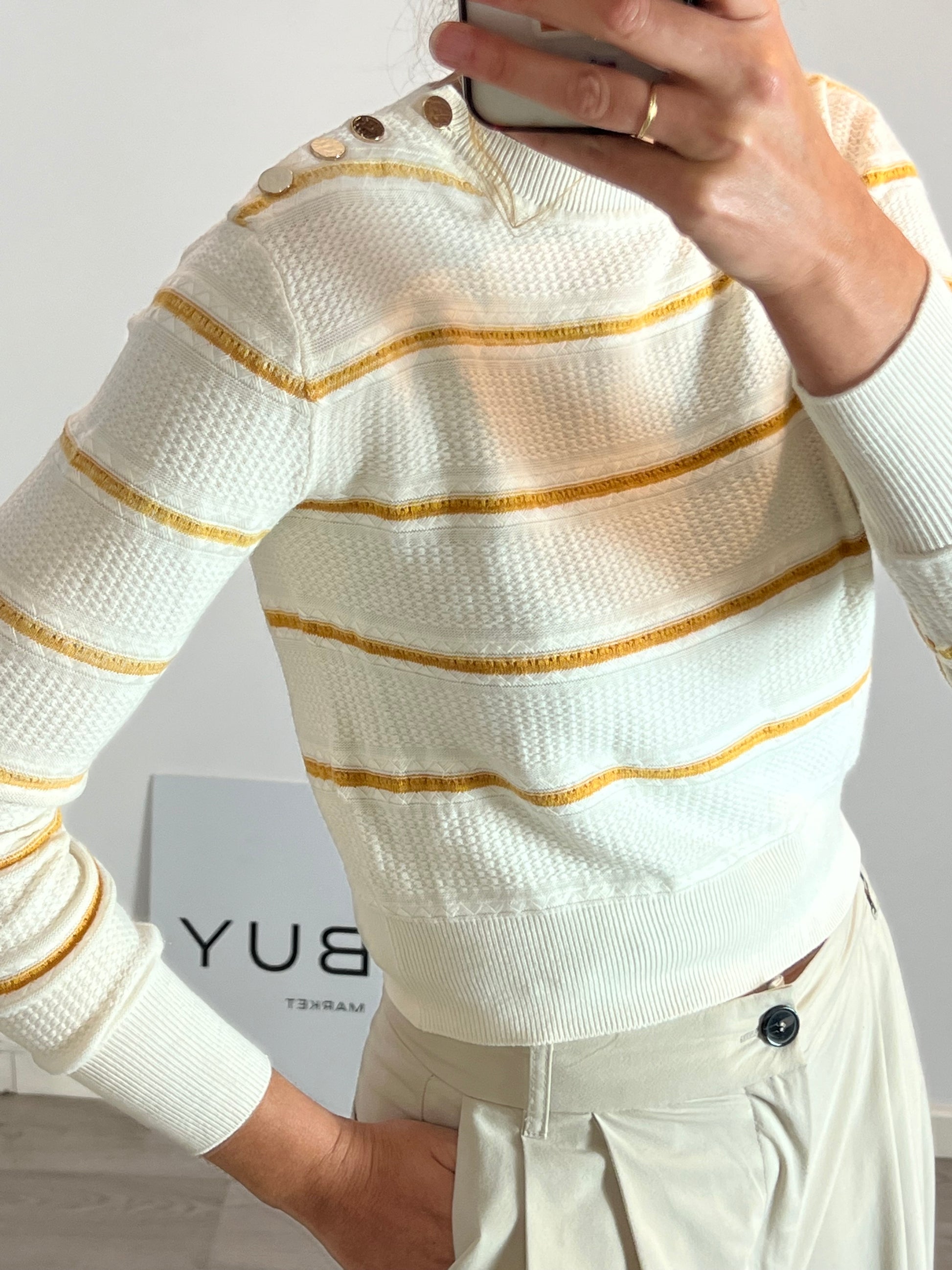 Jersey beige con detalle de rayas mostaza y botones en un hombro.