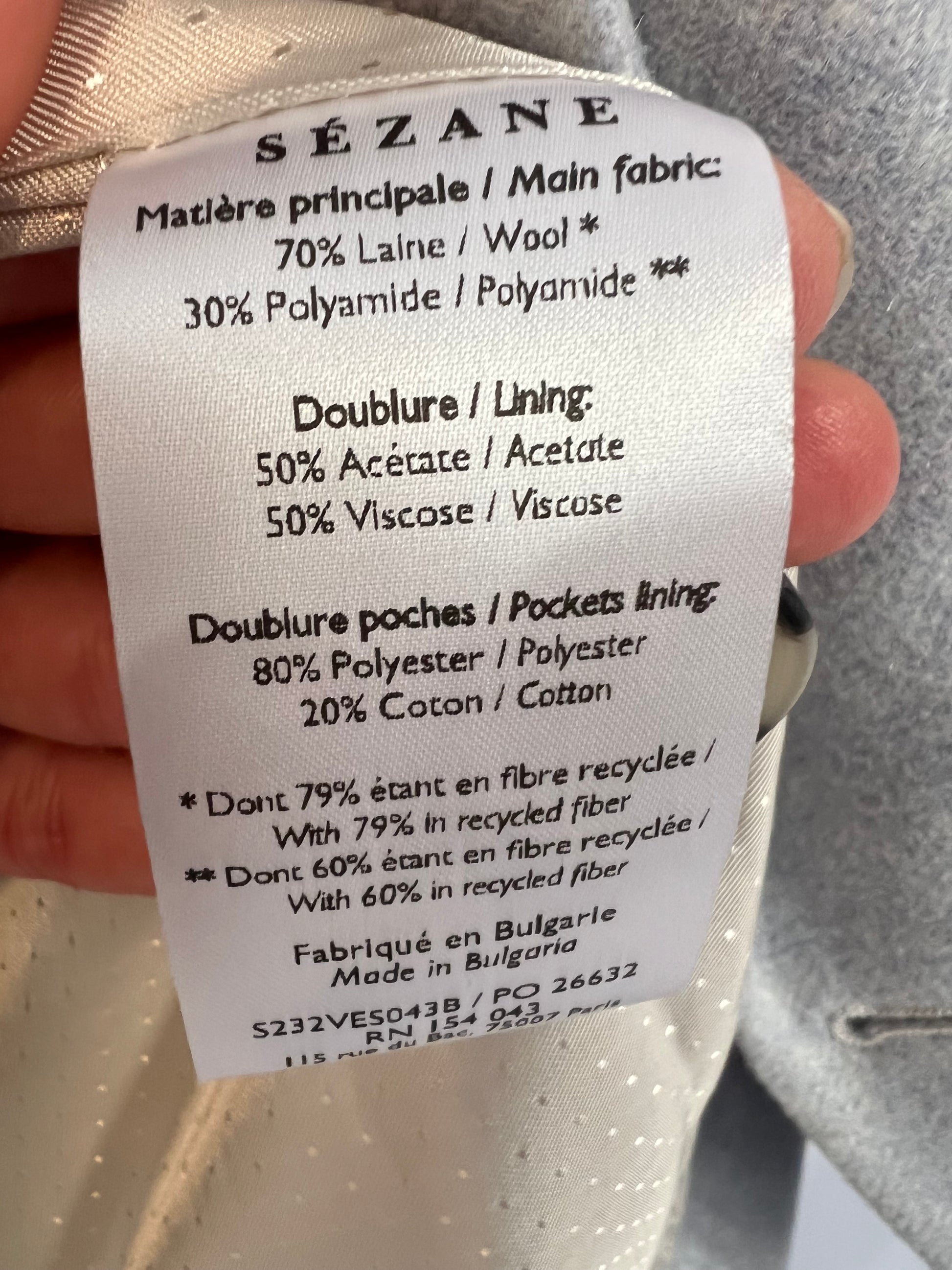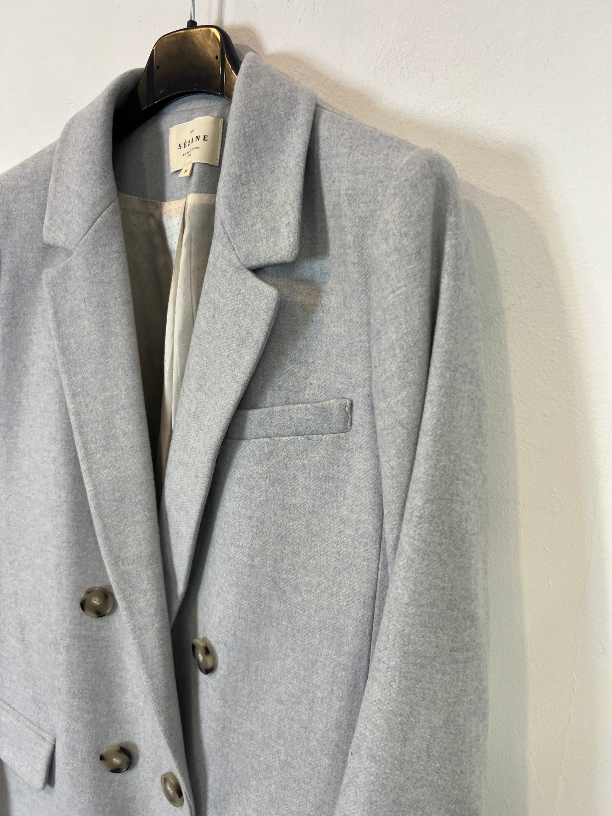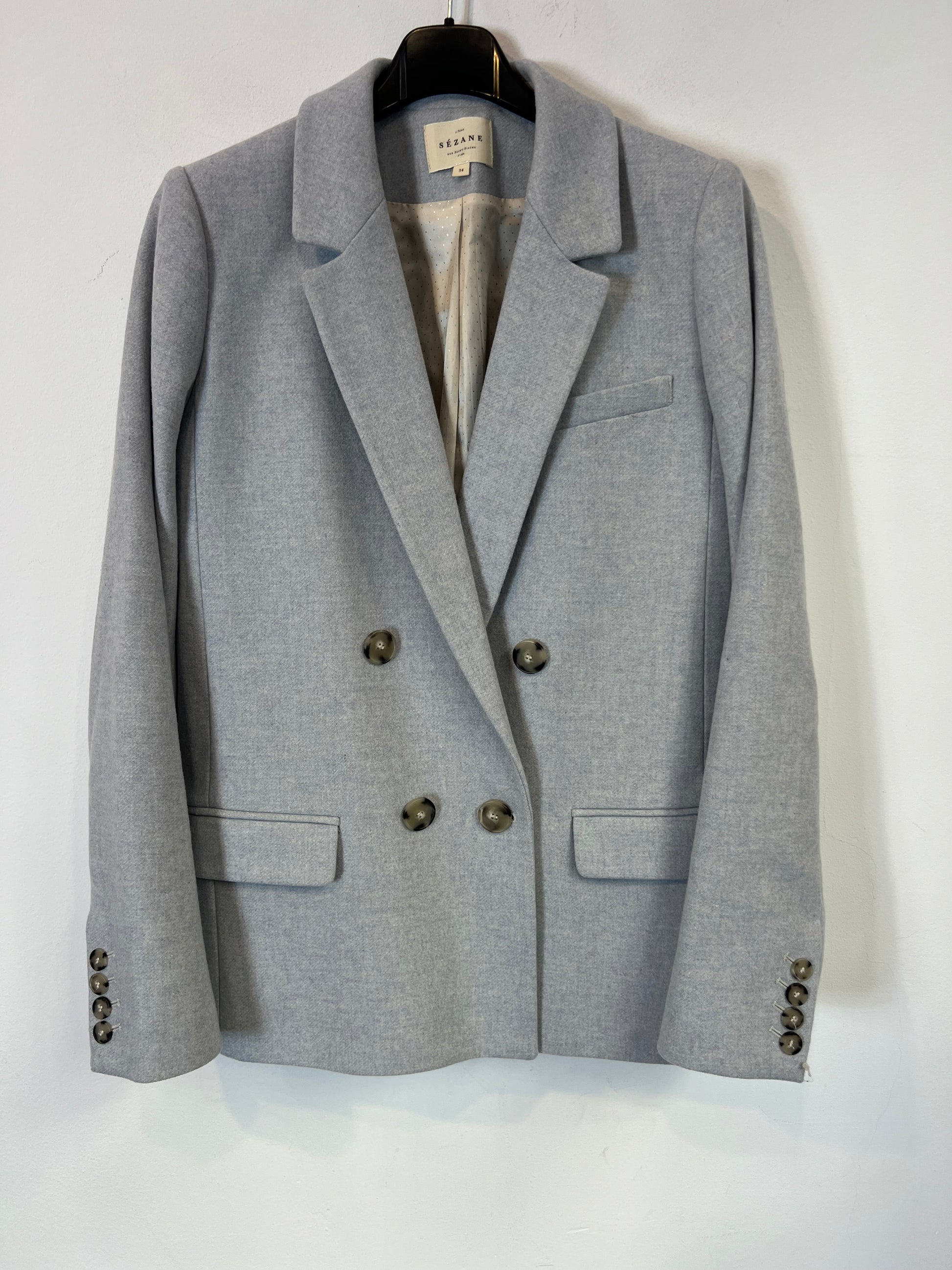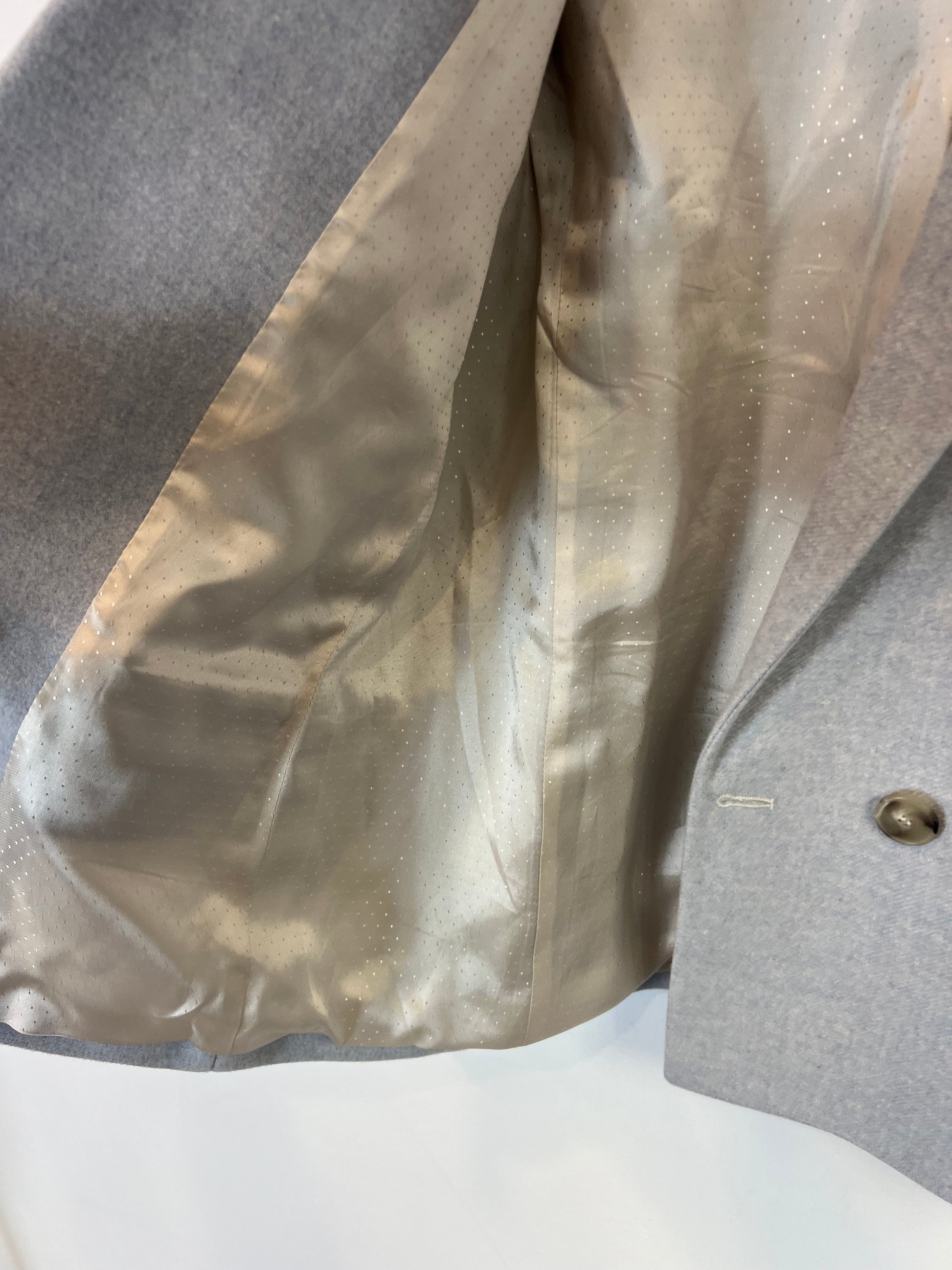 Light blue wool blazer, shoulders 37 cm from seam to seam, back 48 cm, length 63 cm