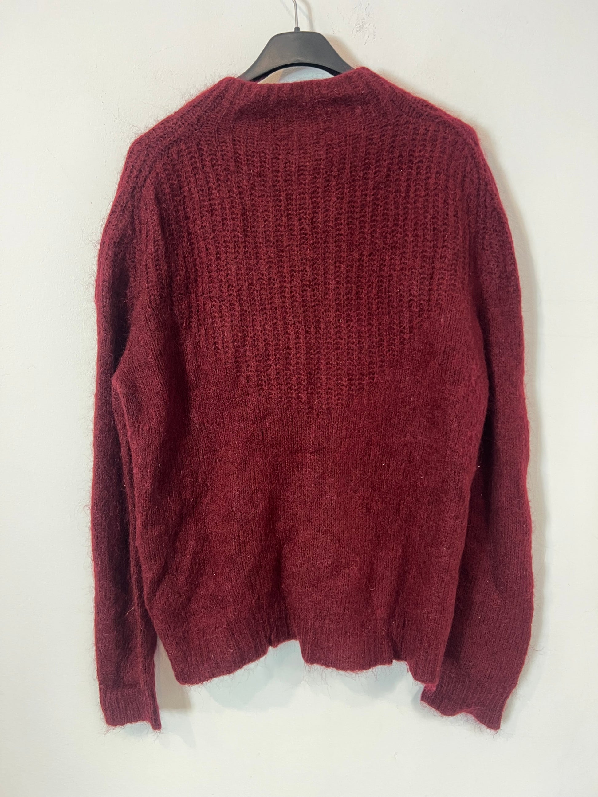 Burgundy sweater with button detail at the neckline. 53 cm from armhole to armhole and 60 cm long.