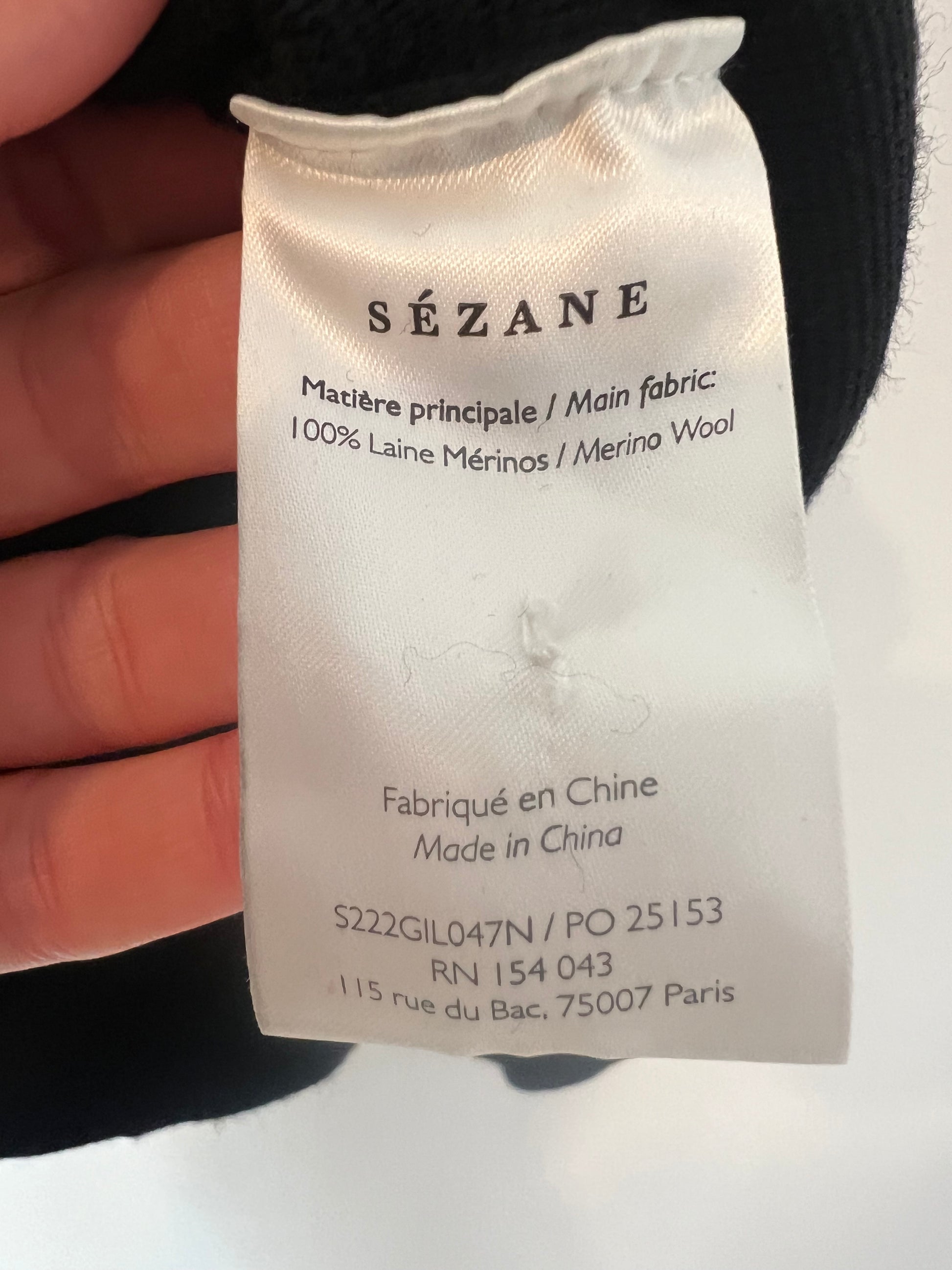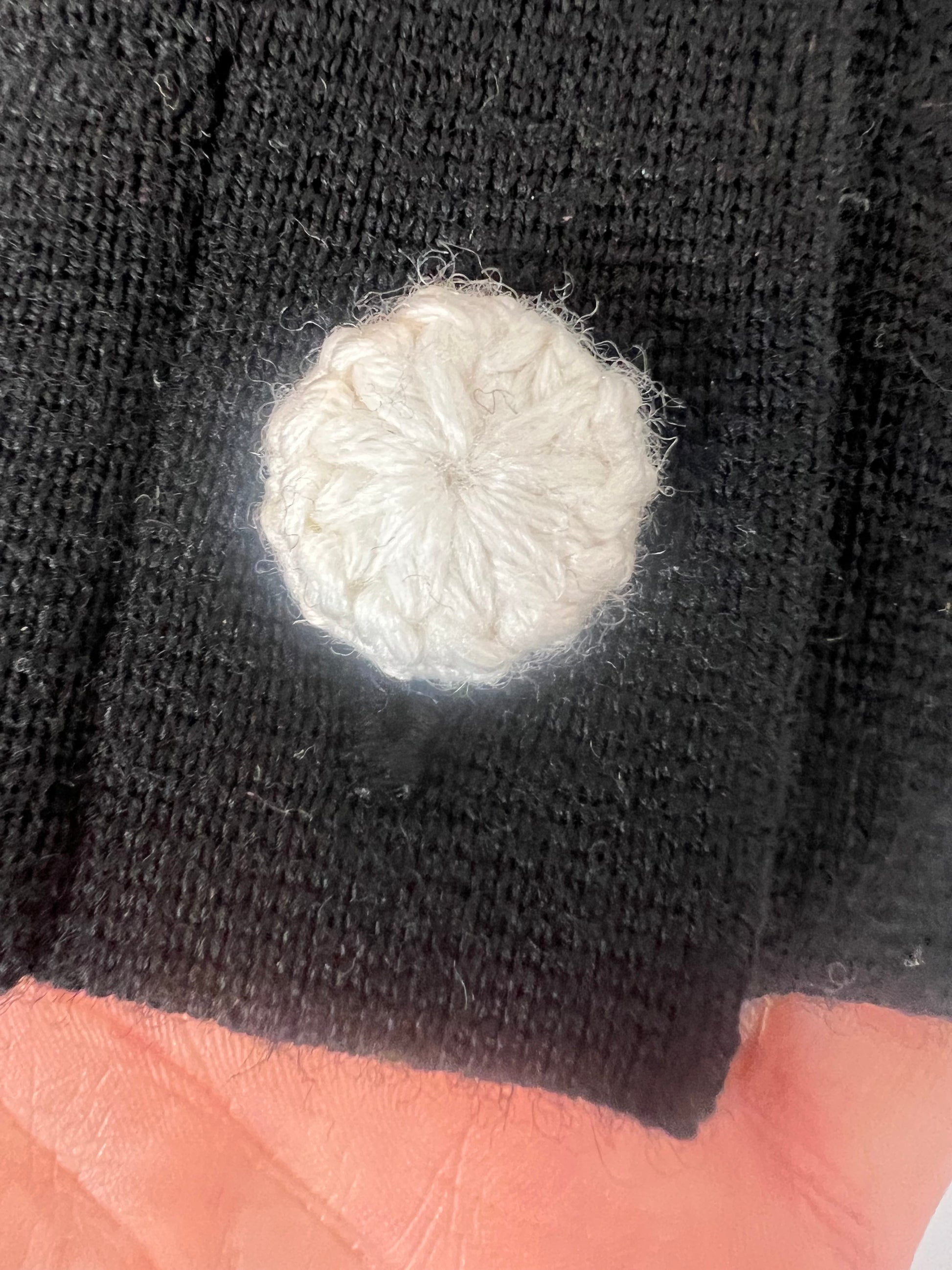 Black wool button-down jacket with a wide collar and white crochet detailing on the collar and buttons. Elasticated waist. 43 cm from armhole to armhole, 53 cm long.