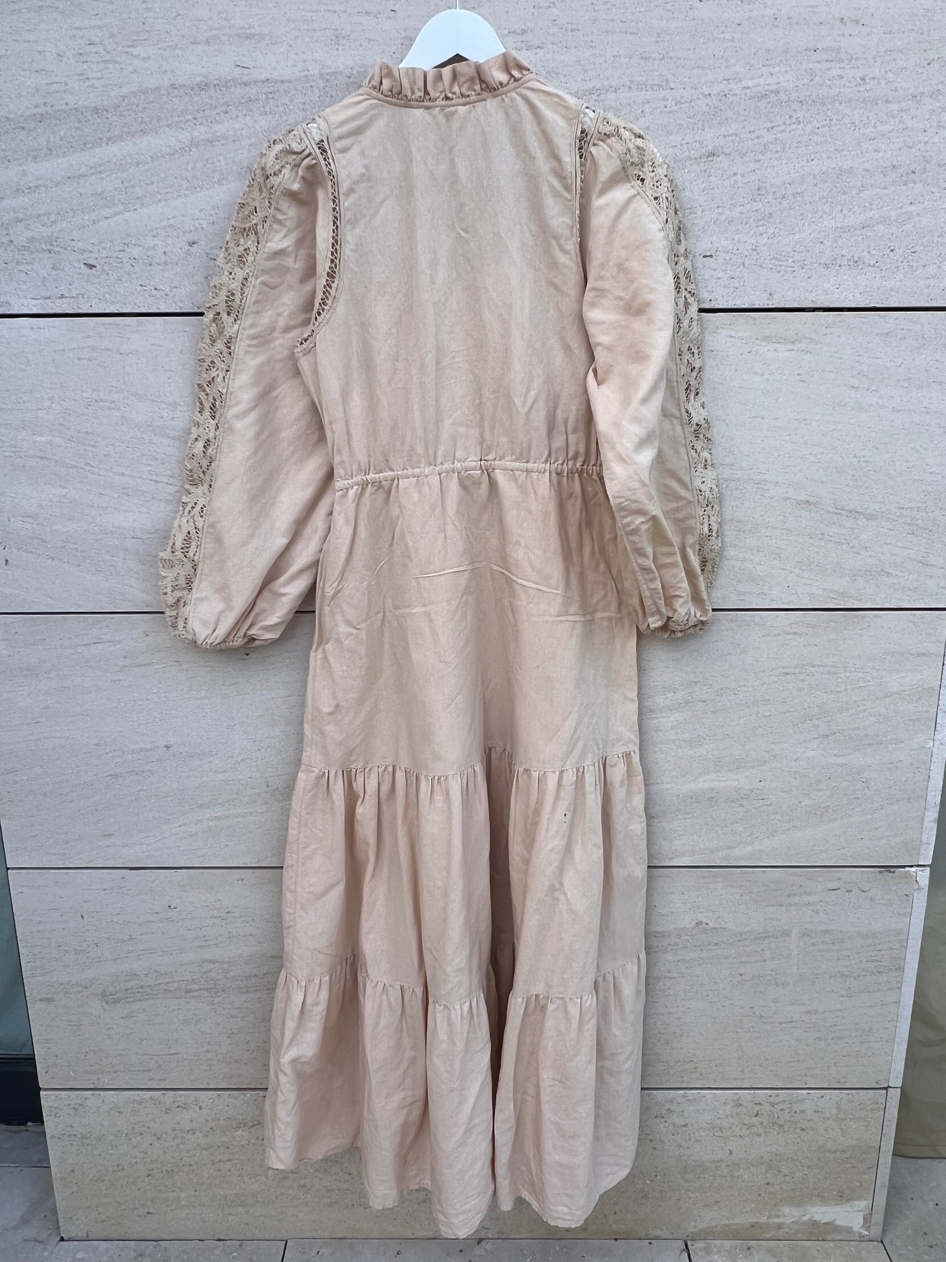 Long beige dress with elastic waist and lace detail. Tara: mini stain at the bottom (photo)