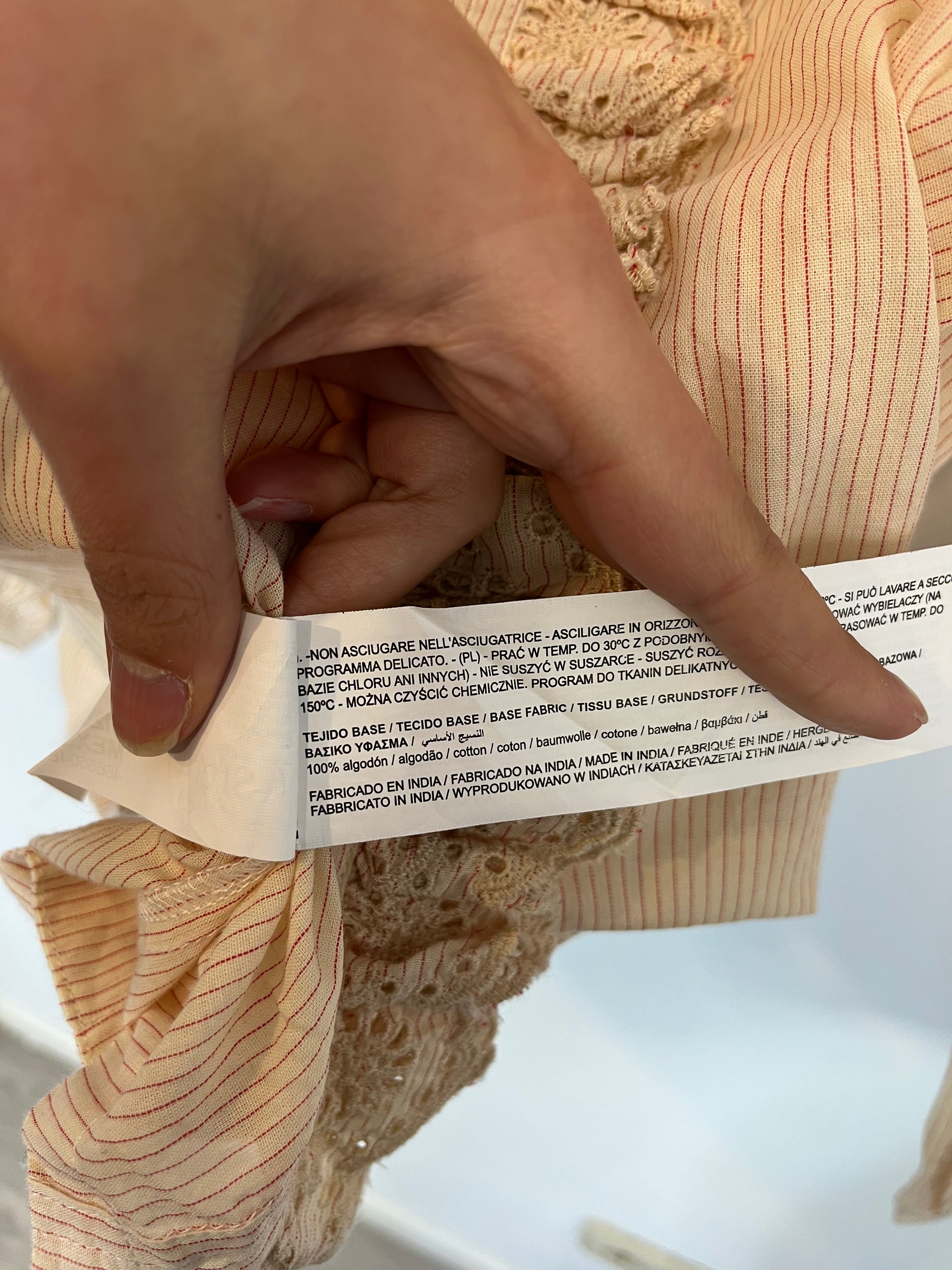 Beige blouse with burgundy stripes and embroidered ruffle. Back 50 cm, length 58 cm.