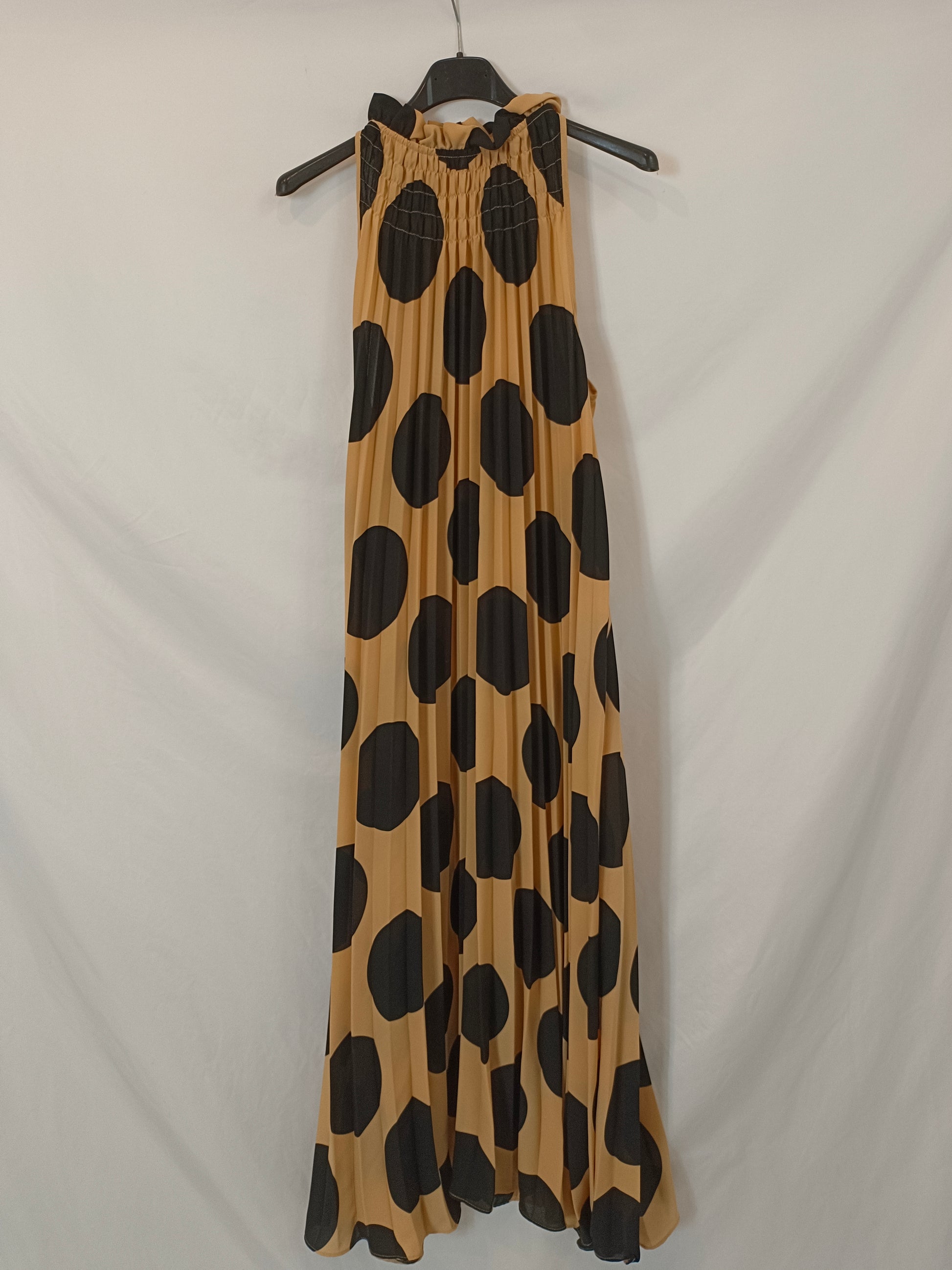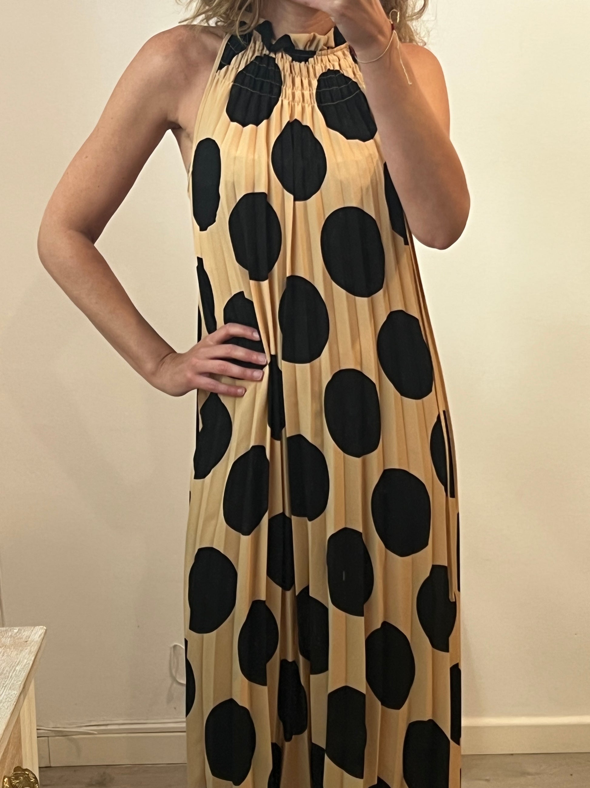 Camel pleated midi dress with black polka dots. Length 122 cm