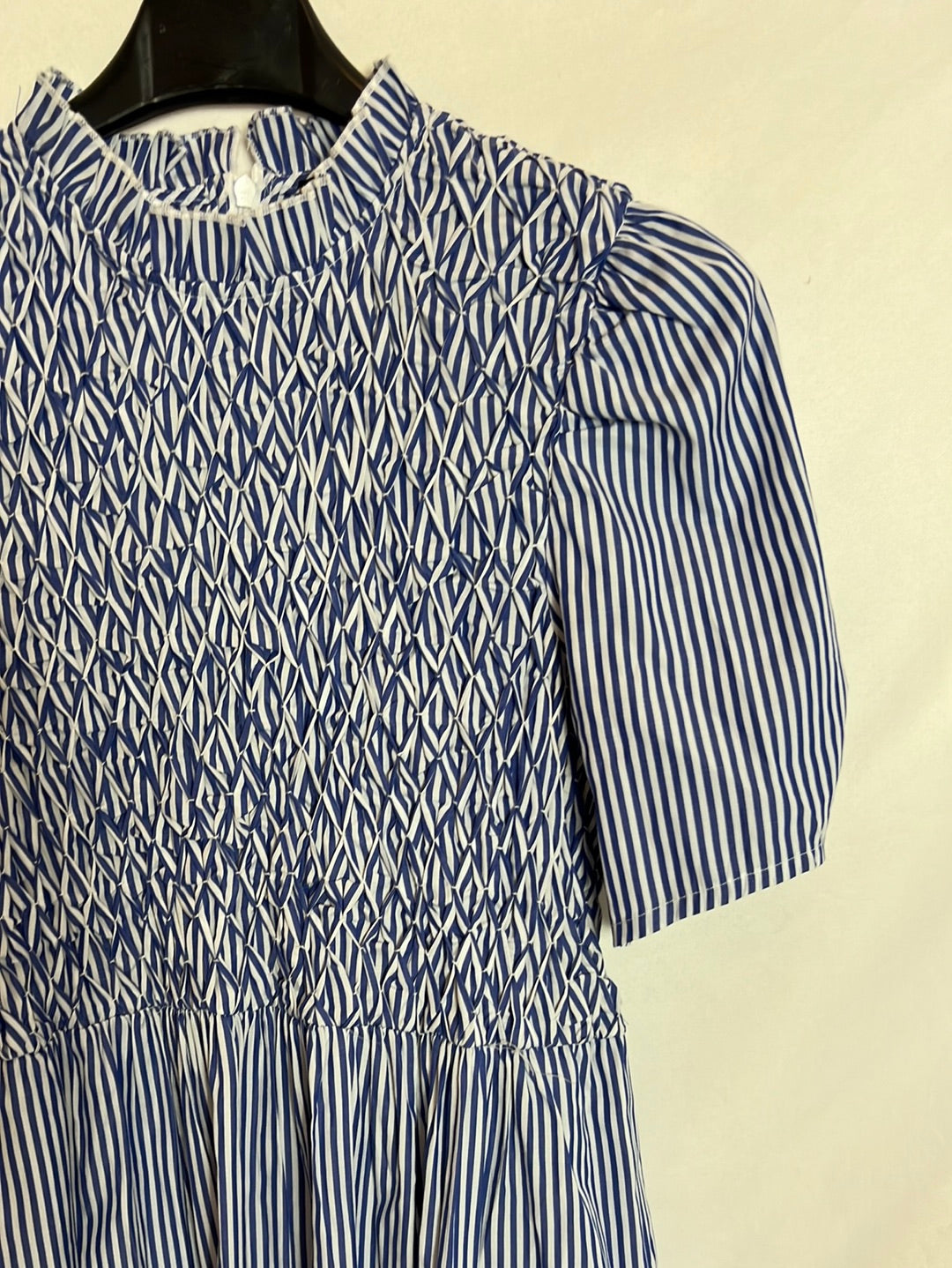 Striped midi dress with puffed sleeves. Length: 129 cm