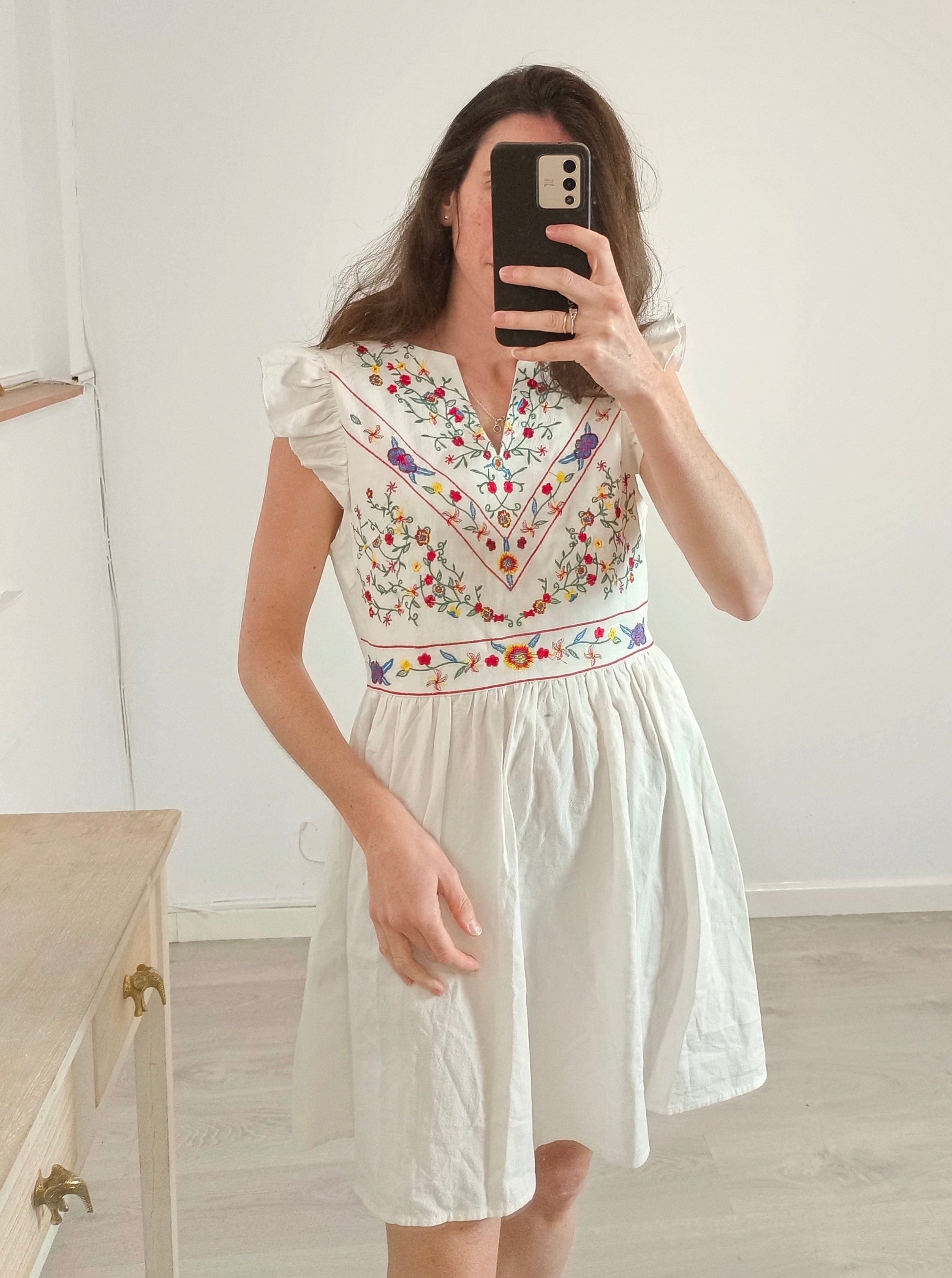 Short white dress with floral embroidered neckline. From armpit to armpit 44 cm. Length 82 cm.