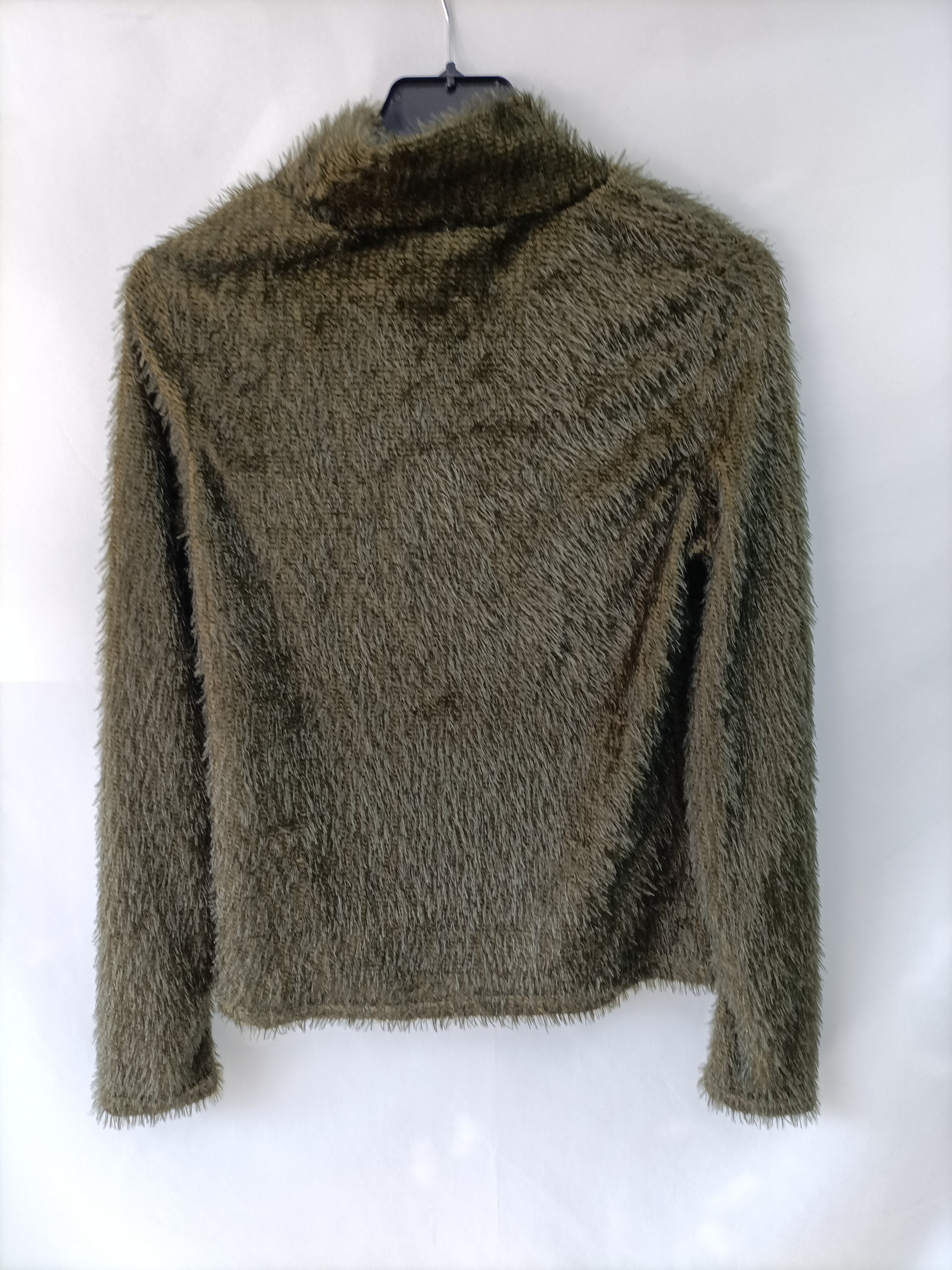 Green fuzzy sweater with a crew neck. Flowy and stretchy. Lightweight. 55 cm long.