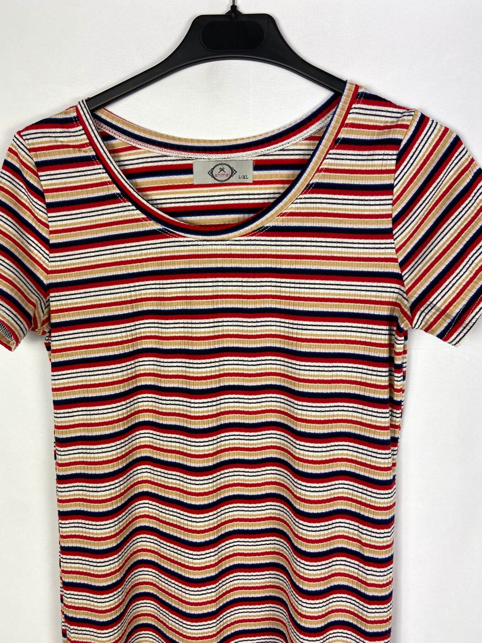 SHIMAI l/xl vestido midi punto canalé con rayas multicolor. Aperturas laterales. Elástico. Largo 126cm