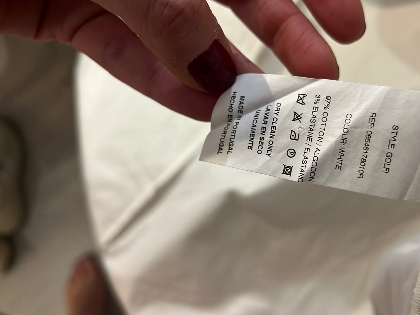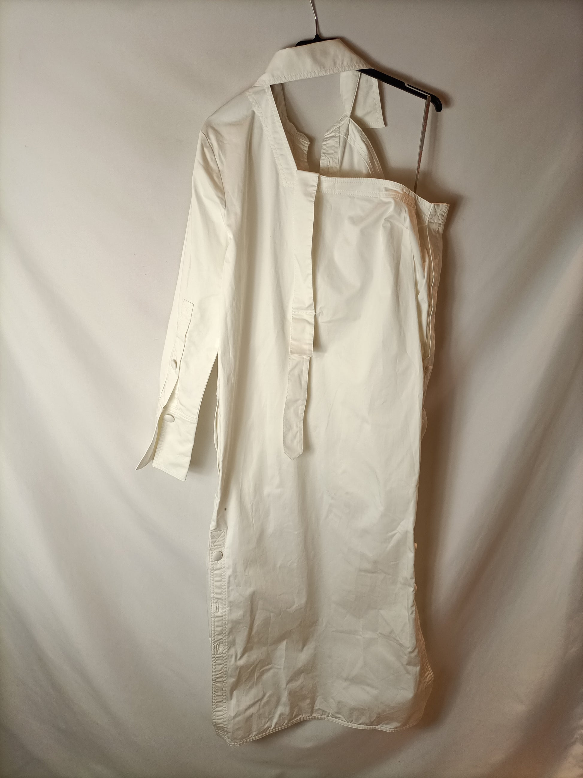 97% cotton. White asymmetric-sleeve shirt dress with pockets. 17.75" armhole to armhole, 51" length, 130" hip, semi-elastic.