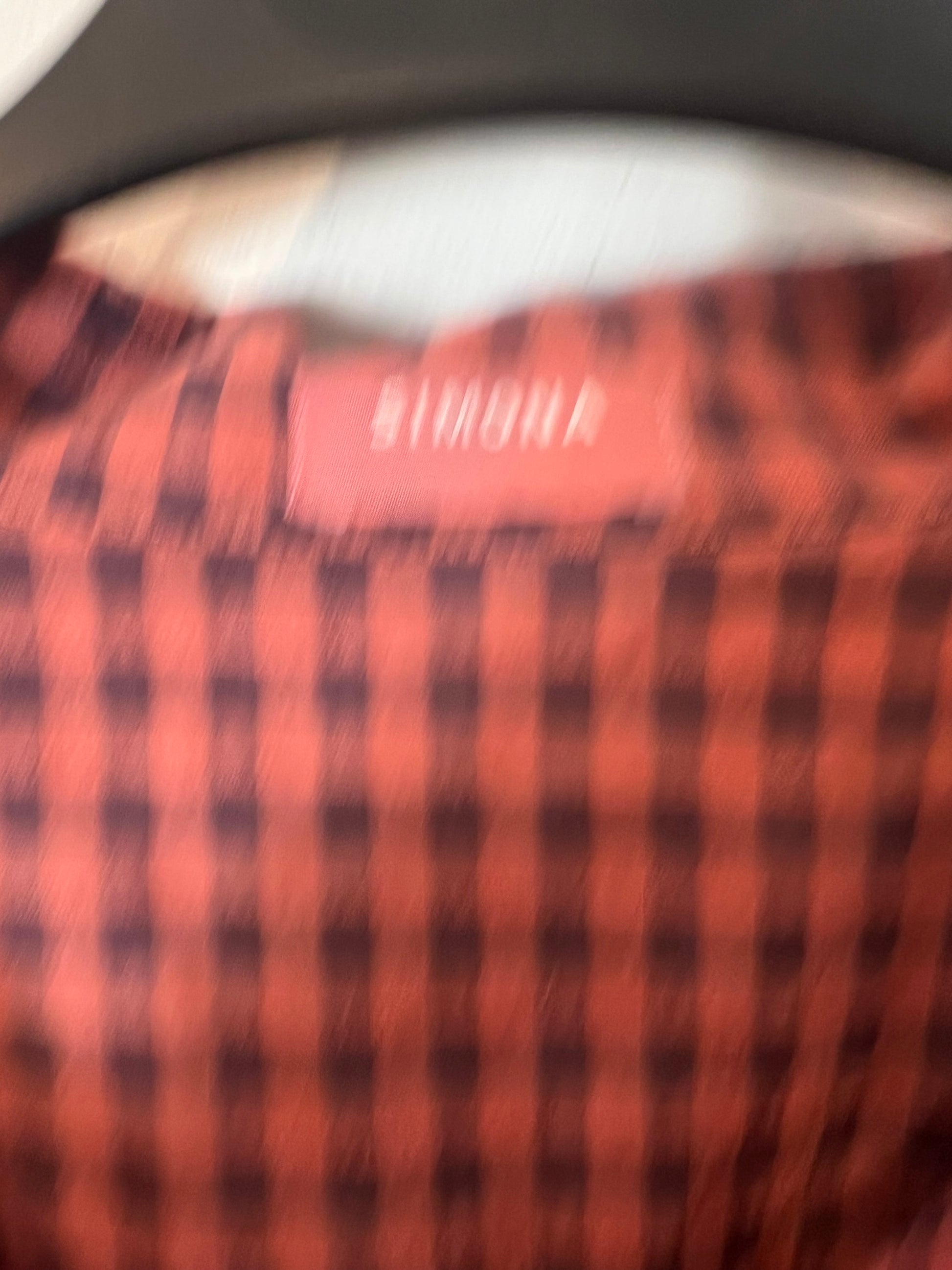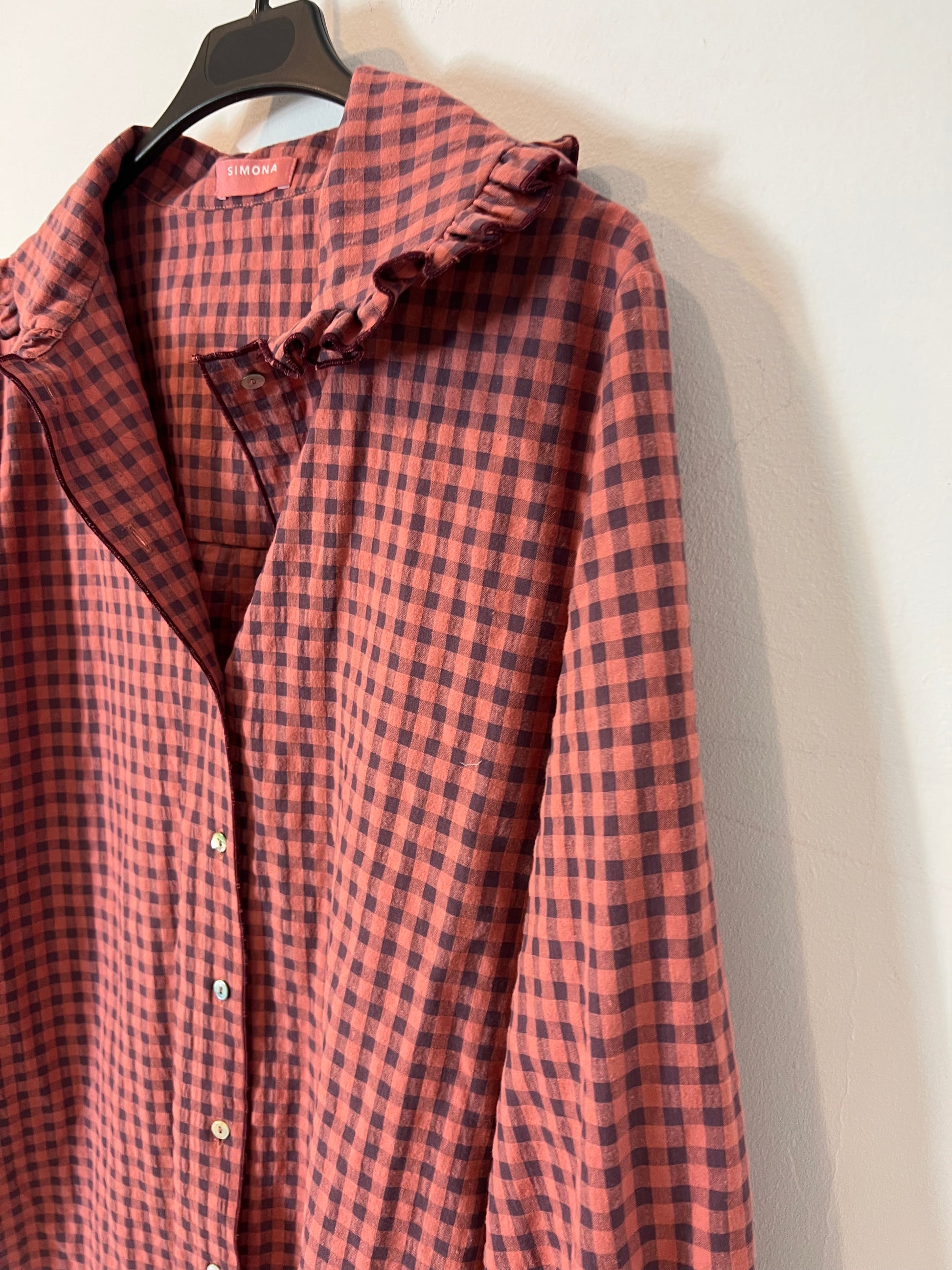Flowy blouse in pink and purple gingham with a baby-doll collar. 51cm from armhole to armhole, 63cm long.