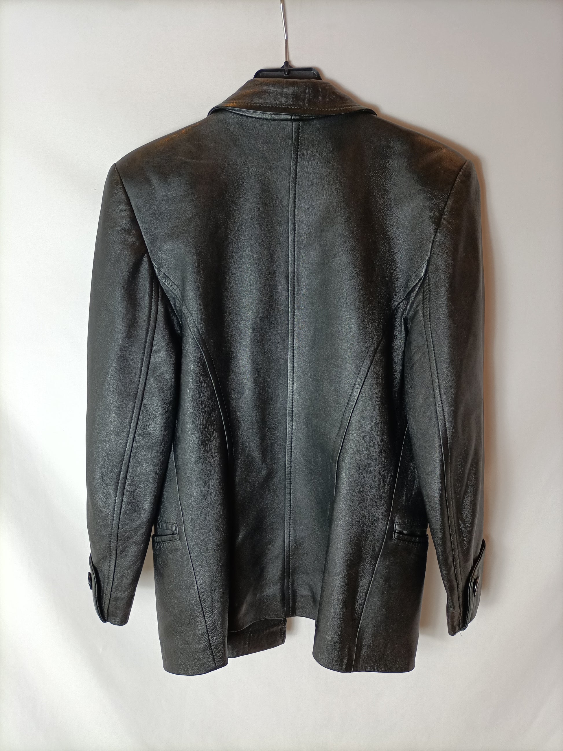 Black jacket with pockets. No interior tag to verify skin type. 3/4 sleeves.