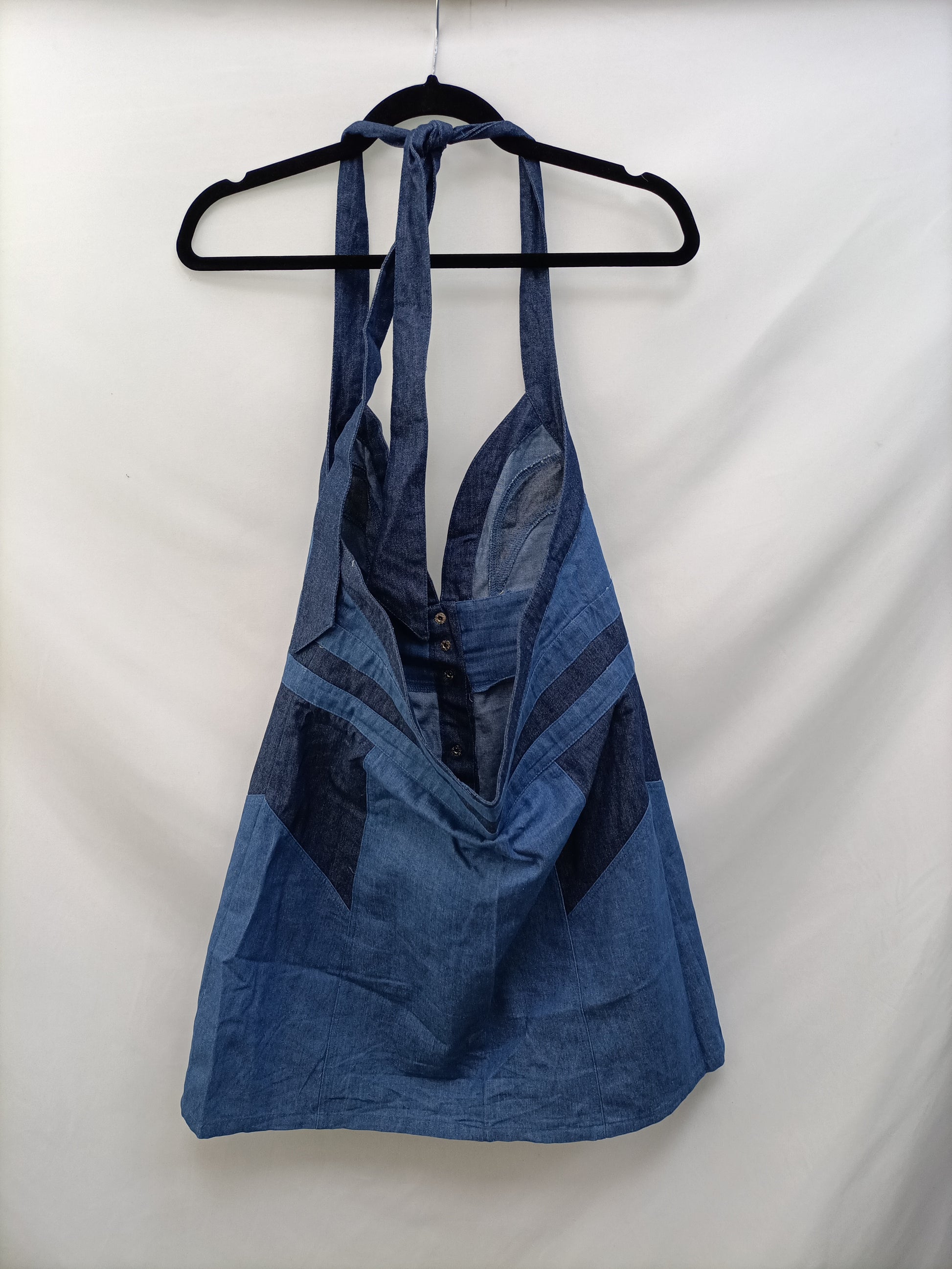 Denim in various shades with an open back. Waist 46 cm, length 74 cm.